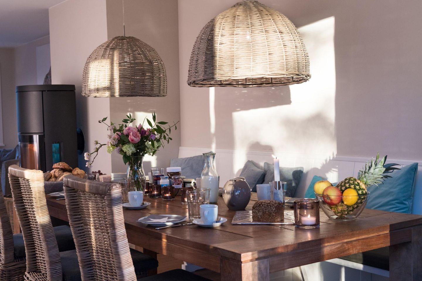 In diesem ruhig gelegenen Reetdachdoppelhaus im klassischen Friesenstil bleiben keine Wünsche offen! Die sehr gute Aufteilung bietet neben dem großzügigen Wohn-Essbereich auch ein separates Arbeitszimmer mit Schreibtisch vor dem Sprossenfenster mit Blick in den Garten. Für gemütliche Wärme sorgen die Fußbodenheizung und der charmante Kaminofen, der so positioniert ist, dass er optisch für eine harmonische Abgrenzung von Wohn- und Essbereich sorgt. Zwei große doppelflügelige Terrassentüren, eine nach Westen, die andere nach Osten, garantieren, dass Sie die Sonne vom Frühstück bis zum Abend genießen können. Vier Schlafzimmer und drei Duschbäder runden das großzügige Angebot komfortabel ab. Lassen Sie sich von dem modernen und hochwertigen Interieur bezaubern!