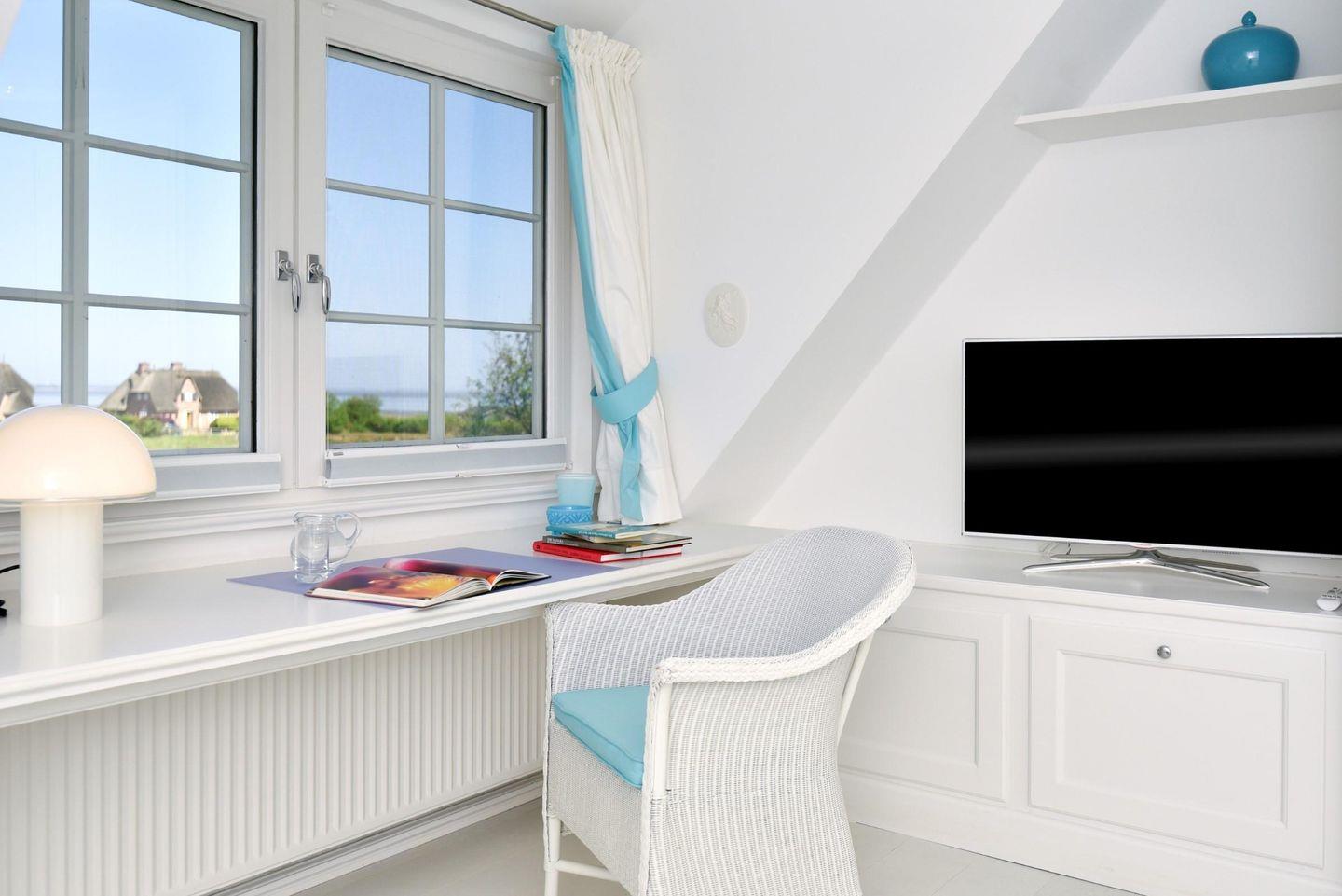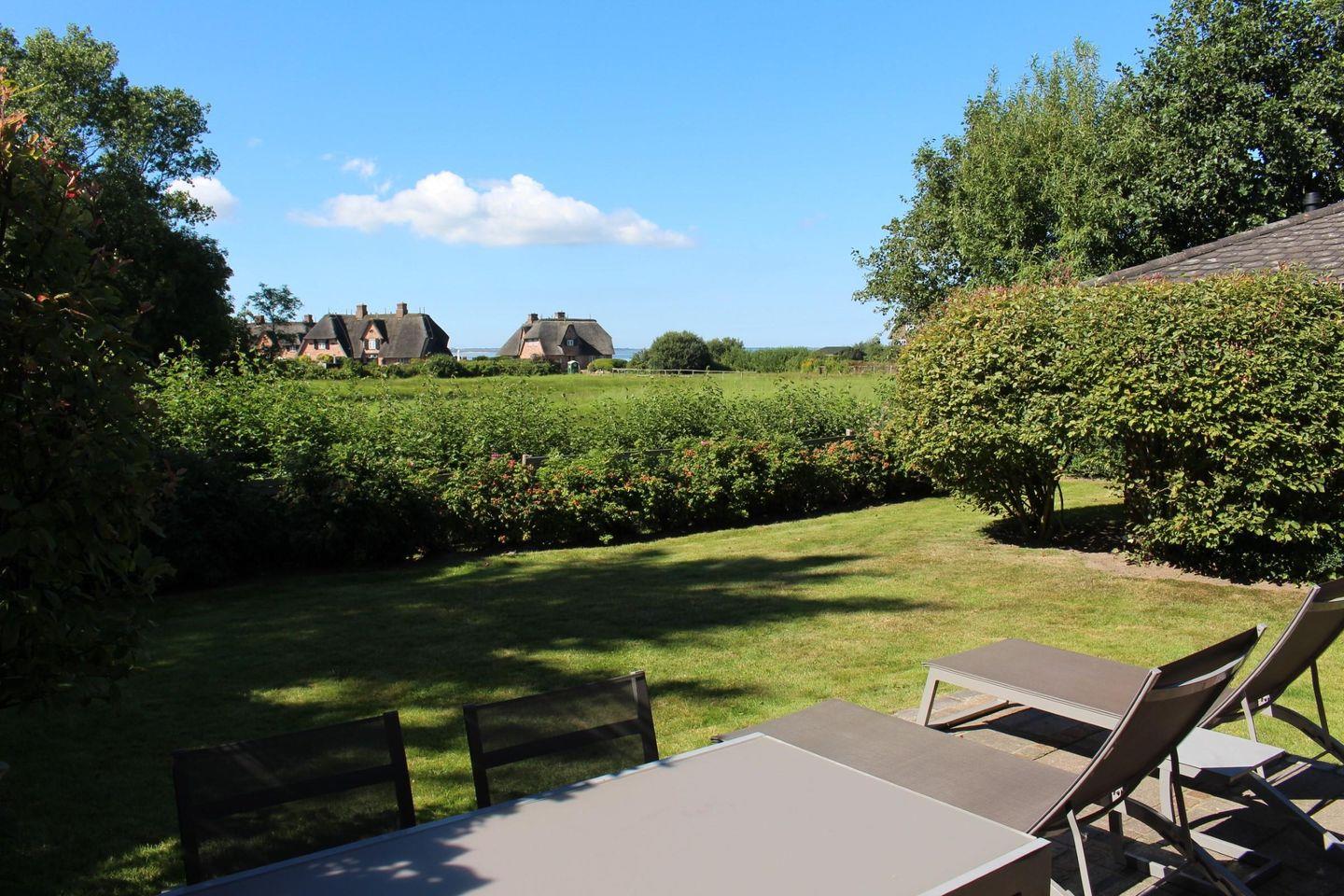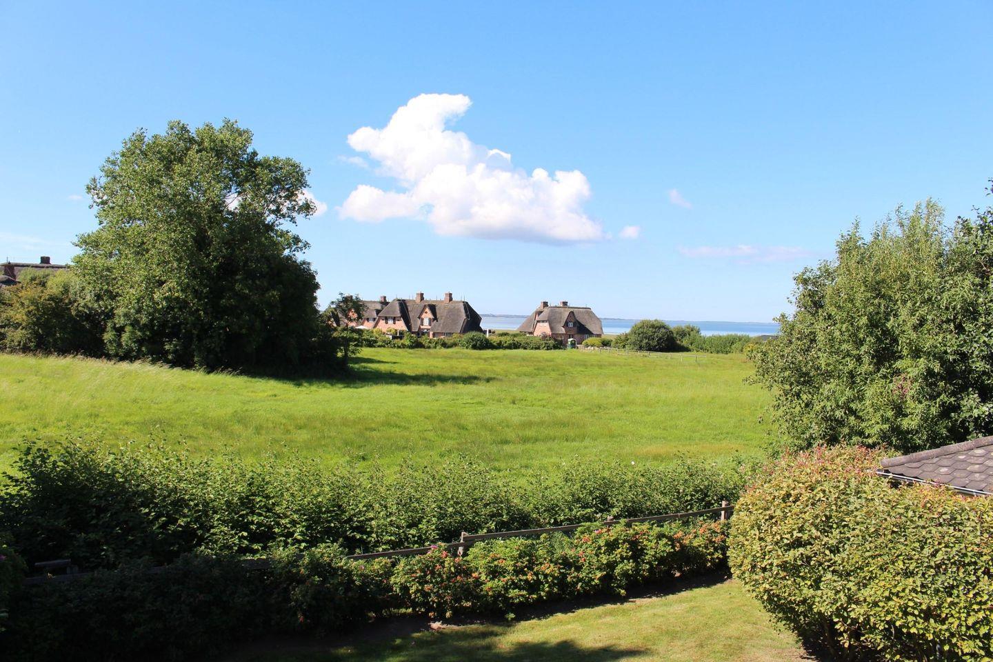 Tolles Haus in schöner Lage! Dieses hell und luftig eingerichtete Ferienhaus mit herrlichem Weitblick liegt ruhig am Ende einer Sackgasse. Eine Mischung aus hellen Farben und lichtdurchfluteten Räumen schafft eine wohltuende Atmosphäre. Der Gas-Kamin im Wohnzimmer verleiht dem Raum Gemütlichkeit und Flair auf Knopfdruck. Egal, ob von der Couch im Erdgeschoss oder vom Schreibtisch im Obergeschoss: Sie genießen einen traumhaften Blick über die Felder bis aufs Wattenmeer. Von hier aus kann man bei guter Sicht sogar den Kampener Leuchtturm sehen. Im Sommer erleben Sie die Weite und Schönheit der Insel am besten mit einem guten Glas Wein im Strandkorb auf Ihrer hauseigenen Terrasse. Urlaub für die Seele!