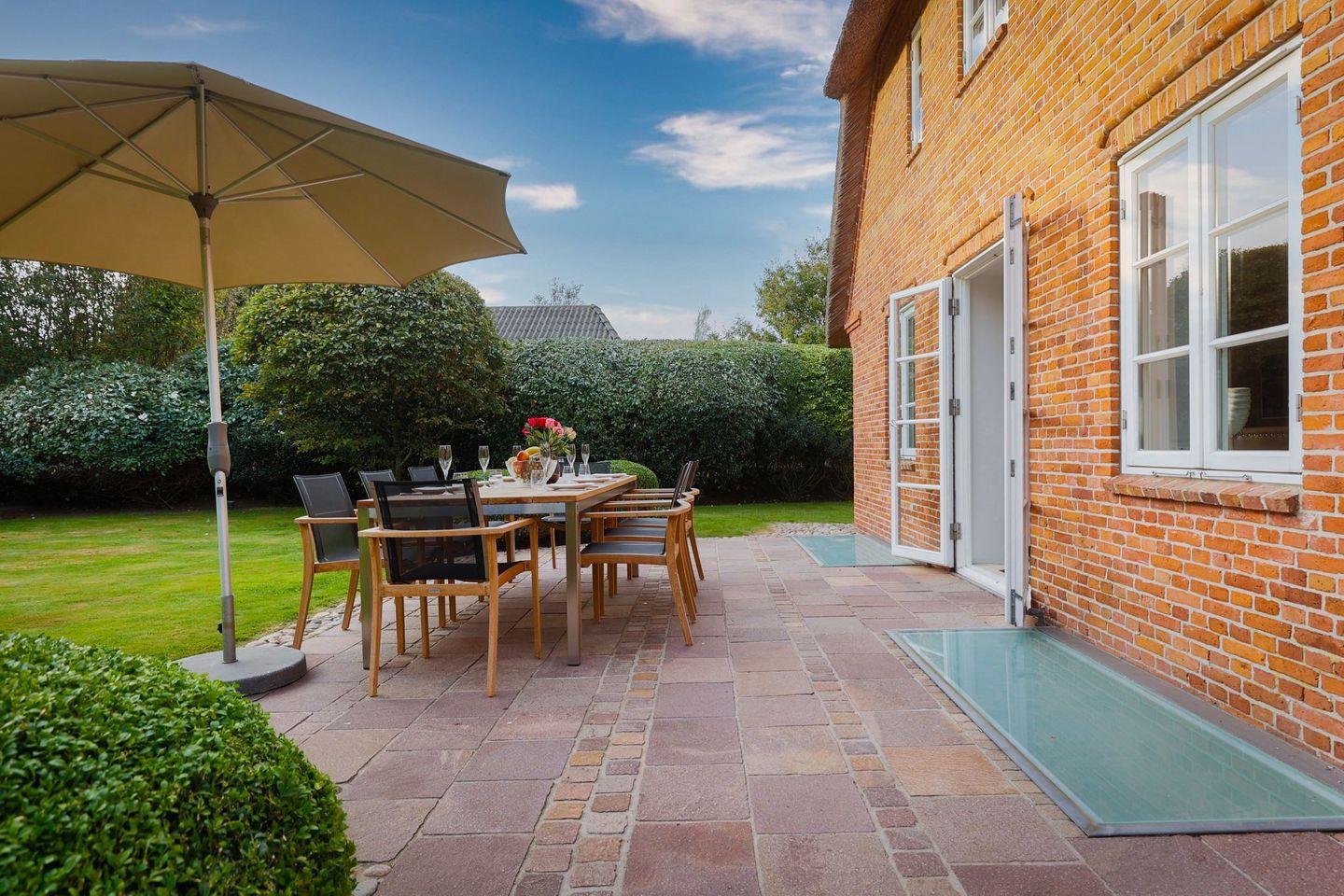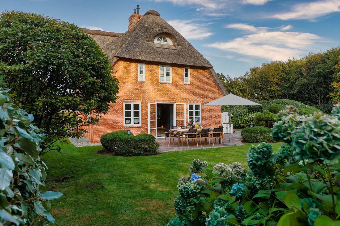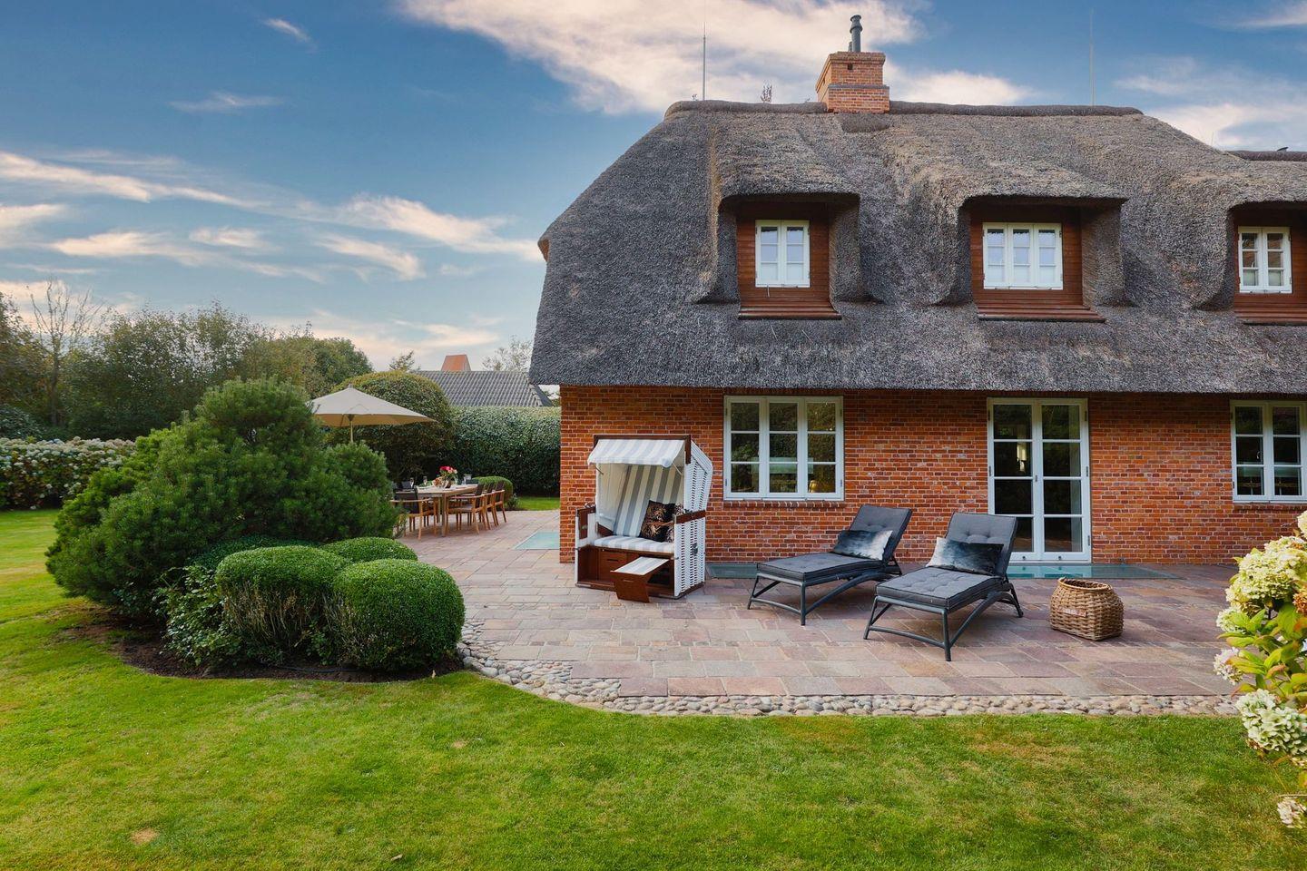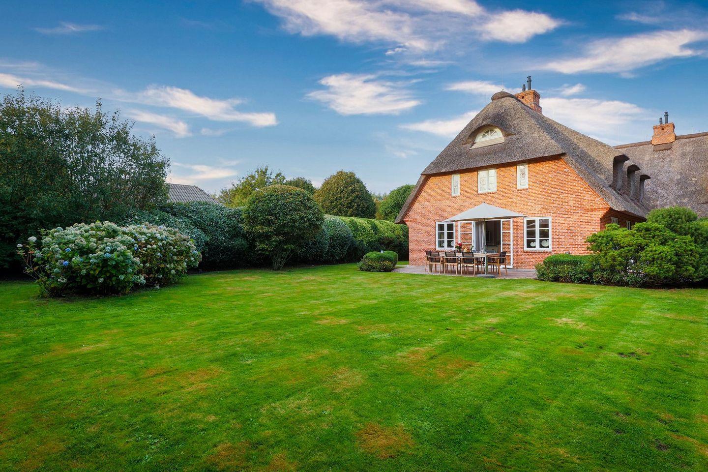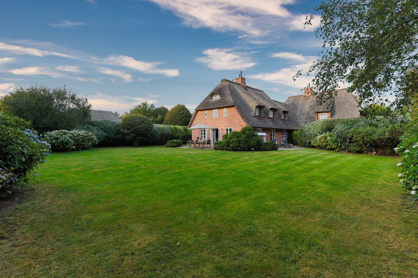 Das Haus ist hochwertig und exklusiv ausgestattet und von einem großzügigen Garten umgeben. Selbstverständlich ist dieses Haus mit 5 Sternen des DTV klassifiziert. Diese mit Reet gedeckte Doppelhaushälfte mit Einzelhaus-Charakter liegt fußläufig zur Keitumer St. Severin und in unmittelbarer Nähe zum Wattenmeer. Das helle und großzügige Objekt über drei Ebenen (EG, OG, Souterrain) ist ca. 260 m² groß und bietet zwei bis acht Personen ausreichend Platz. Das geräumige und hochwertige Haus liegt auf einem insgesamt 1.000 m² Grundstück südlich der St. Severin Kirche in Keitum. Das exklusive Doppelhaus wurde mit aufgearbeiteten Ziegelsteinen von 1886 erbaut. Die Räumlichkeiten im Erdgeschoß sind mit großflächigen sehr hochwertigen Natur Limestone ausgelegt, im Obergeschoß liegen Echtholzeichendielen, das gesamt Souterrain und die Bäder sind ebenfalls mit Limestone verlegt. Im Erdgeschoss und im Souterrain ist jeweils eine Fussbodenerwärmung integriert, zusätzlich sind auch Heizkonvektoren in allen Räumen angebracht. Auf allen Ebenen finden Sie hochwertige Tischlereinbauten. Darüber hinaus bietet das Haus jeglichen Komfort wie Sauna mit Ruheraum, Gaskamin, Flat-TV's ( streamingfähig) mit Soundbar, WLAN (High-Speed Internet), alle Schlafzimmer und Wohnzimmer mit Flachbildschirmen, Alarmanlage, Geschirrspüler, Mikrowelle, Backofen, Kühlschrank, Nespresso Kaffeemaschine, Induktionsherd, Safe, Hauswirtschaftsraum mit Waschmaschine und Trockner und zwei Pkw-Stellplätze. Bademäntel sind für Sie als unser Gast in diesem Domizil kostenfrei. Die Betten sind jeweils 1,80 x 2,00 m mit durchgängiger Matratze. Das Haus ist von einem großzügigen gepflegten Garten mit zwei Terrassen und Friesenwälle umgeben. Das Haus ist ausschließlich für Nichtraucher (auf der Terrasse wäre es erlaubt).