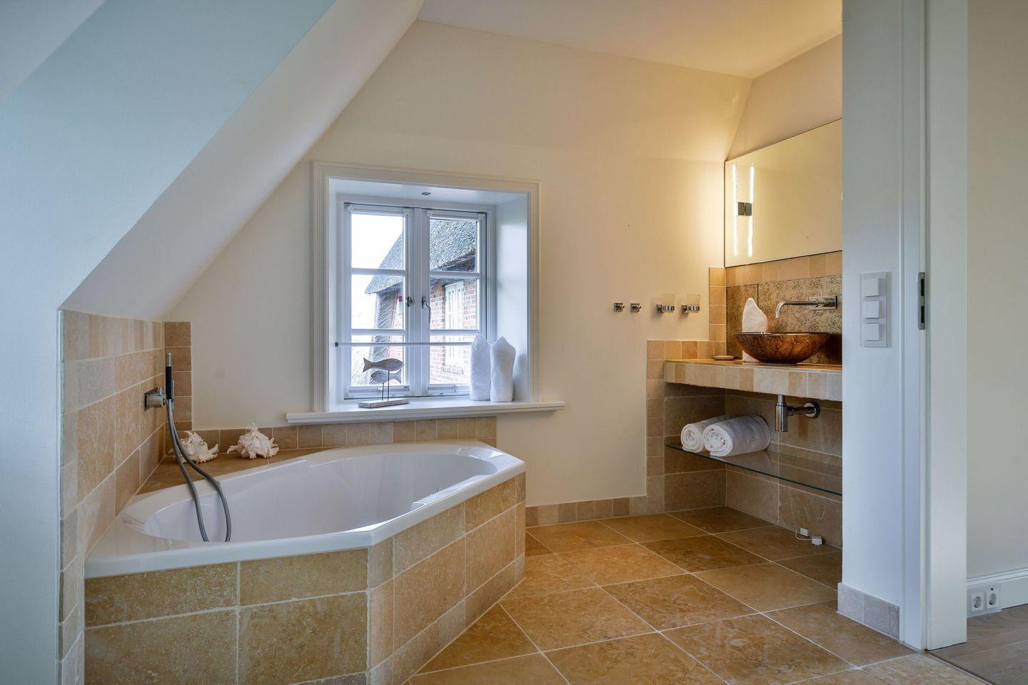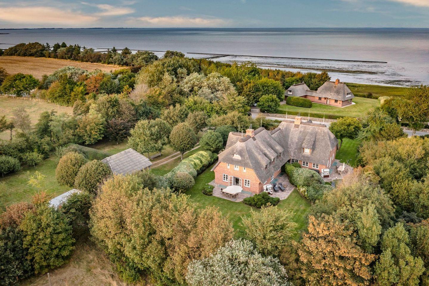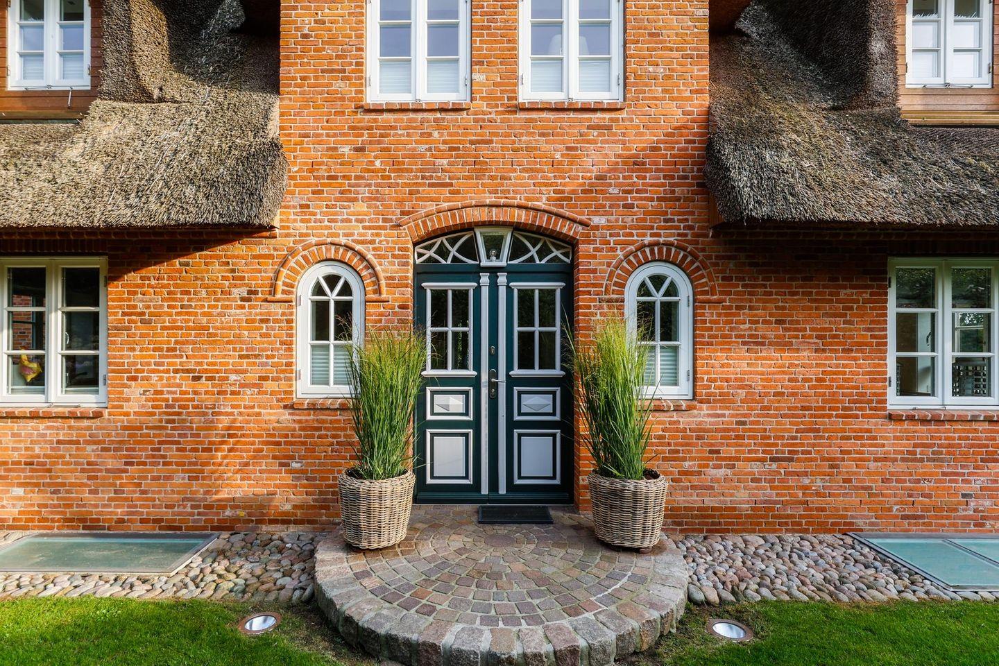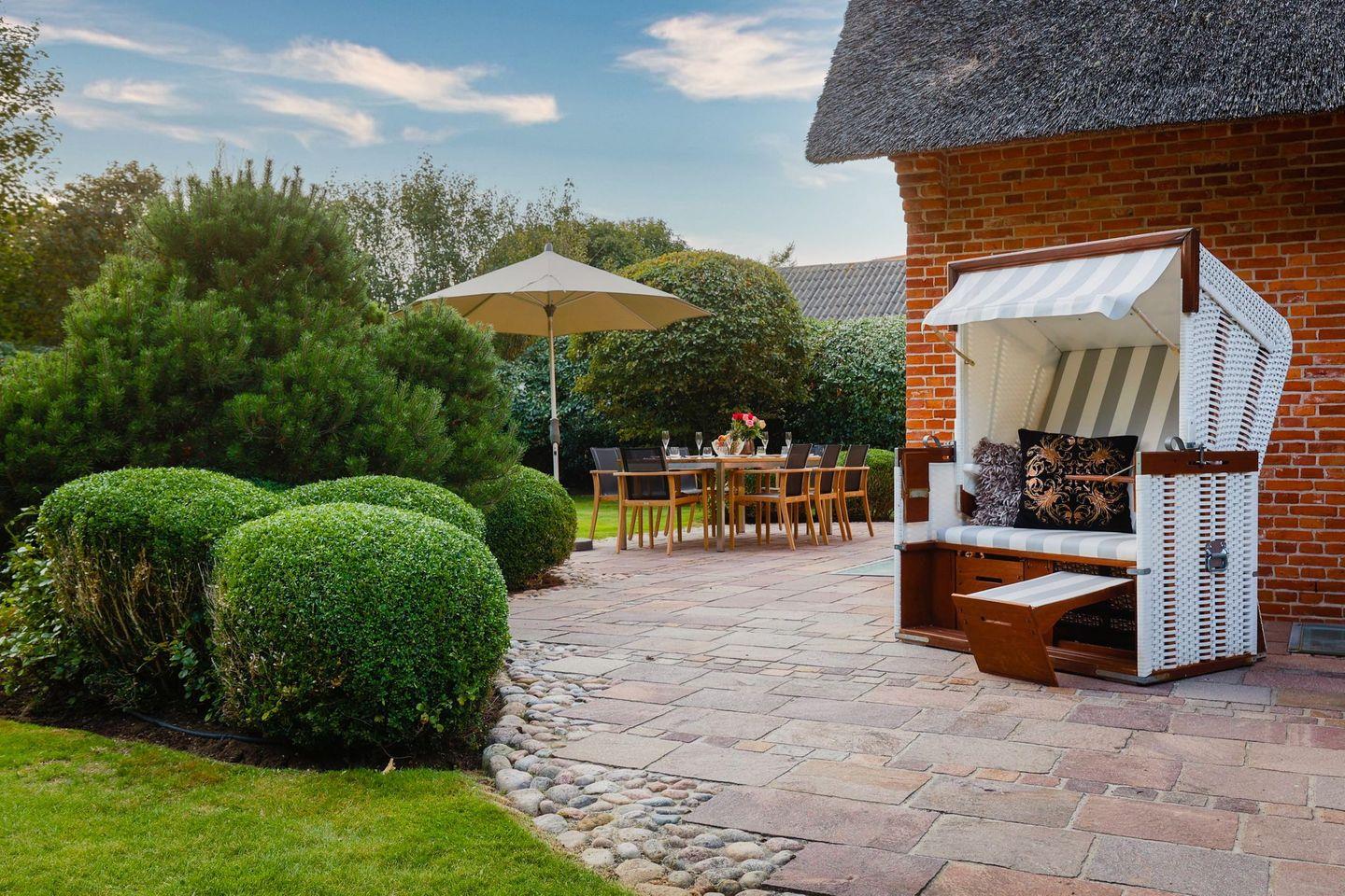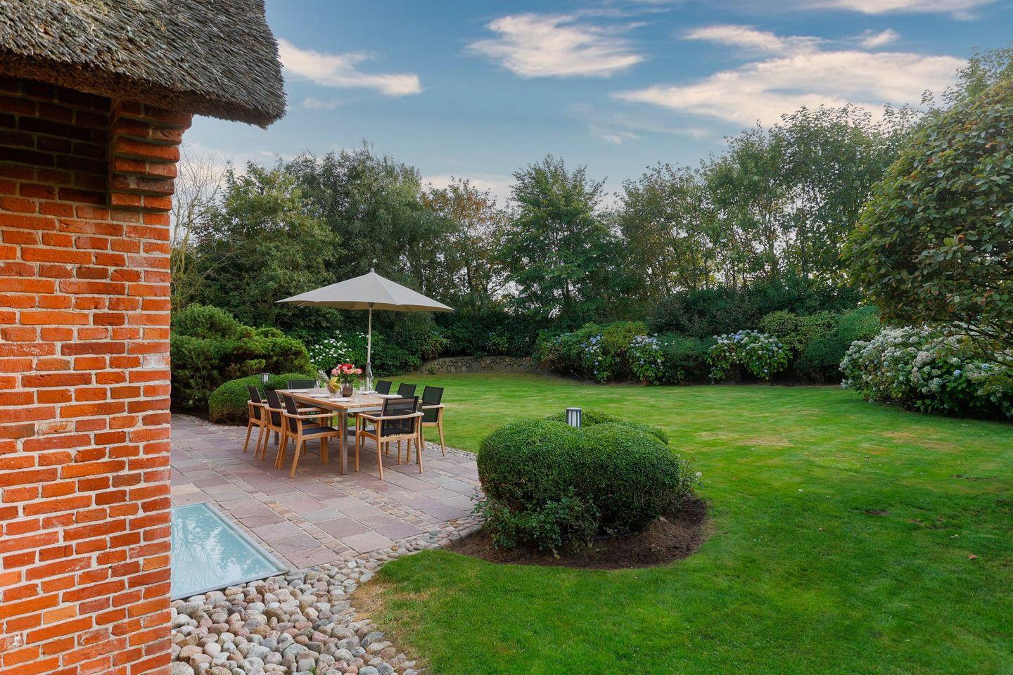 Das Haus ist hochwertig und exklusiv ausgestattet und von einem großzügigen Garten umgeben. Selbstverständlich ist dieses Haus mit 5 Sternen des DTV klassifiziert. Diese mit Reet gedeckte Doppelhaushälfte mit Einzelhaus-Charakter liegt fußläufig zur Keitumer St. Severin und in unmittelbarer Nähe zum Wattenmeer. Das helle und großzügige Objekt über drei Ebenen (EG, OG, Souterrain) ist ca. 260 m² groß und bietet zwei bis acht Personen ausreichend Platz. Das geräumige und hochwertige Haus liegt auf einem insgesamt 1.000 m² Grundstück südlich der St. Severin Kirche in Keitum. Das exklusive Doppelhaus wurde mit aufgearbeiteten Ziegelsteinen von 1886 erbaut. Die Räumlichkeiten im Erdgeschoß sind mit großflächigen sehr hochwertigen Natur Limestone ausgelegt, im Obergeschoß liegen Echtholzeichendielen, das gesamt Souterrain und die Bäder sind ebenfalls mit Limestone verlegt. Im Erdgeschoss und im Souterrain ist jeweils eine Fussbodenerwärmung integriert, zusätzlich sind auch Heizkonvektoren in allen Räumen angebracht. Auf allen Ebenen finden Sie hochwertige Tischlereinbauten. Darüber hinaus bietet das Haus jeglichen Komfort wie Sauna mit Ruheraum, Gaskamin, Flat-TV's ( streamingfähig) mit Soundbar, WLAN (High-Speed Internet), alle Schlafzimmer und Wohnzimmer mit Flachbildschirmen, Alarmanlage, Geschirrspüler, Mikrowelle, Backofen, Kühlschrank, Nespresso Kaffeemaschine, Induktionsherd, Safe, Hauswirtschaftsraum mit Waschmaschine und Trockner und zwei Pkw-Stellplätze. Bademäntel sind für Sie als unser Gast in diesem Domizil kostenfrei. Die Betten sind jeweils 1,80 x 2,00 m mit durchgängiger Matratze. Das Haus ist von einem großzügigen gepflegten Garten mit zwei Terrassen und Friesenwälle umgeben. Das Haus ist ausschließlich für Nichtraucher (auf der Terrasse wäre es erlaubt).