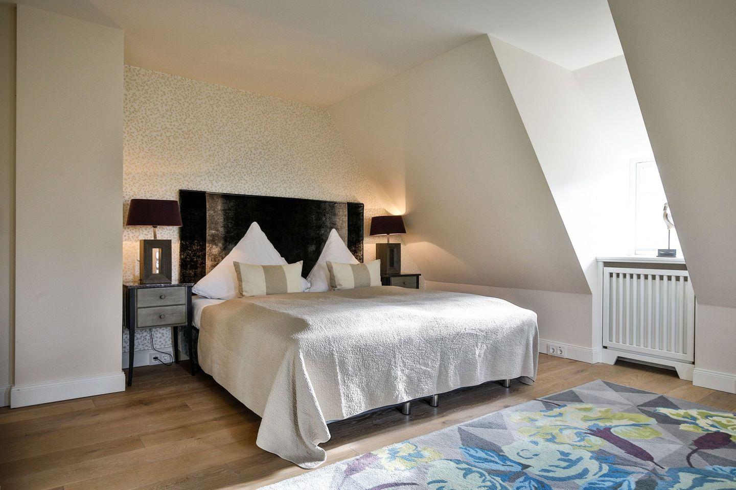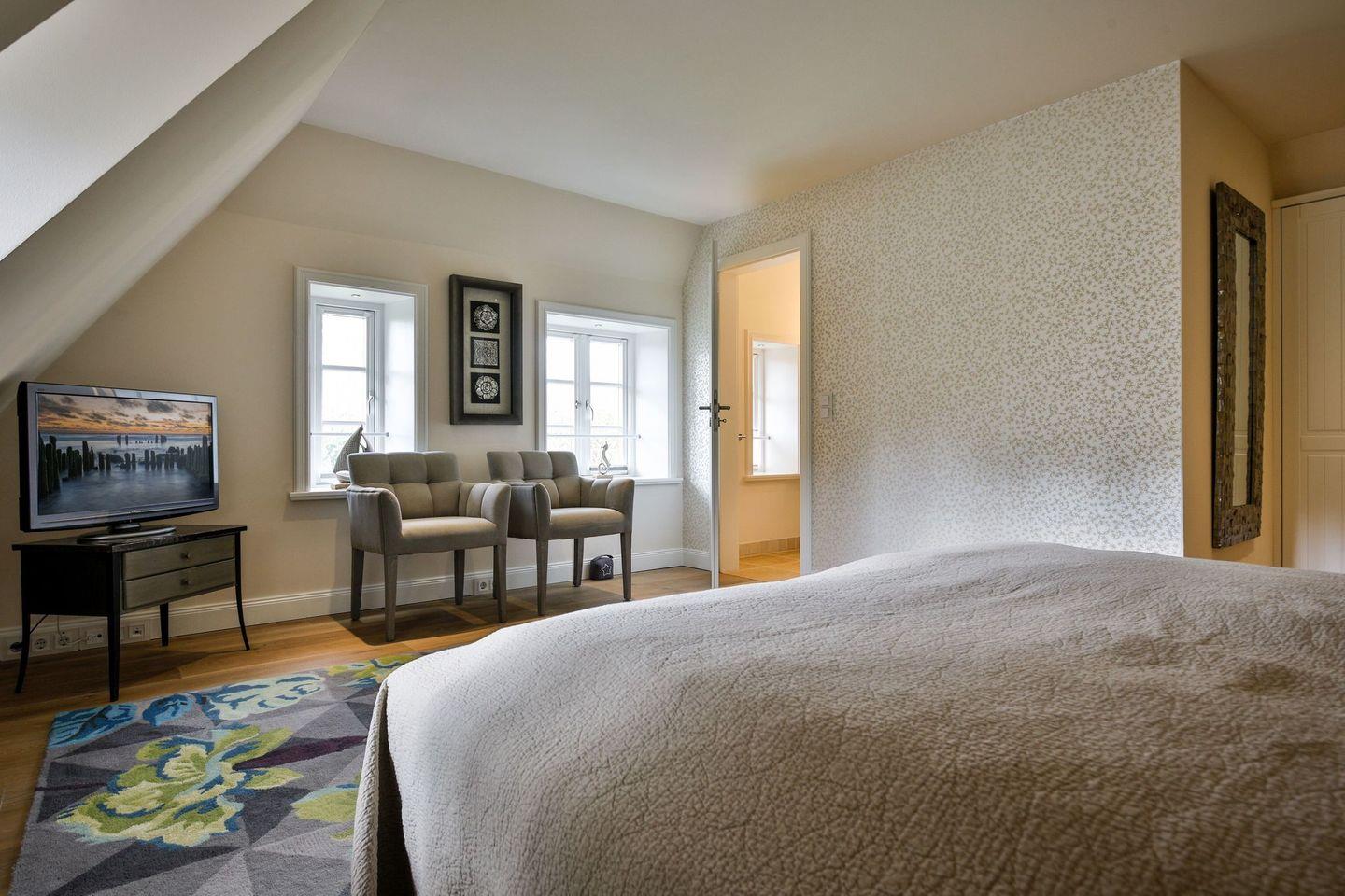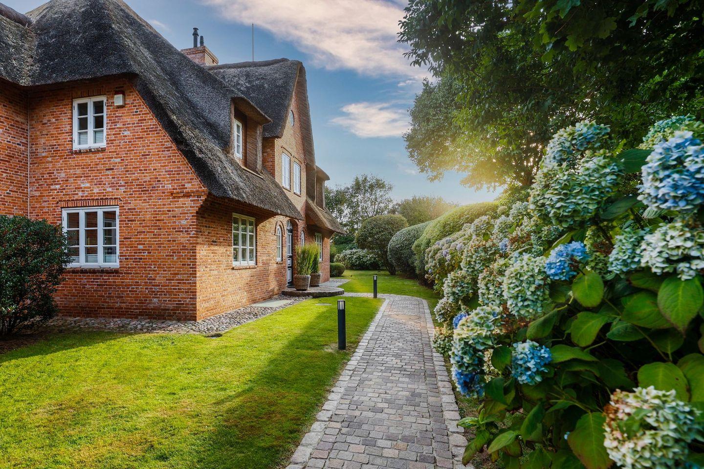 Das Haus ist hochwertig und exklusiv ausgestattet und von einem großzügigen Garten umgeben. Selbstverständlich ist dieses Haus mit 5 Sternen des DTV klassifiziert. Diese mit Reet gedeckte Doppelhaushälfte mit Einzelhaus-Charakter liegt in besonderer Lage an der Keitumer St. Severin in unmittelbarer Nähe zum Wattenmeer. Das helle und großzügige Haus über drei Ebenen (EG, OG, Souterrain) ist ca. 260 m² groß und bietet zwei bis acht Personen ausreichend Platz.