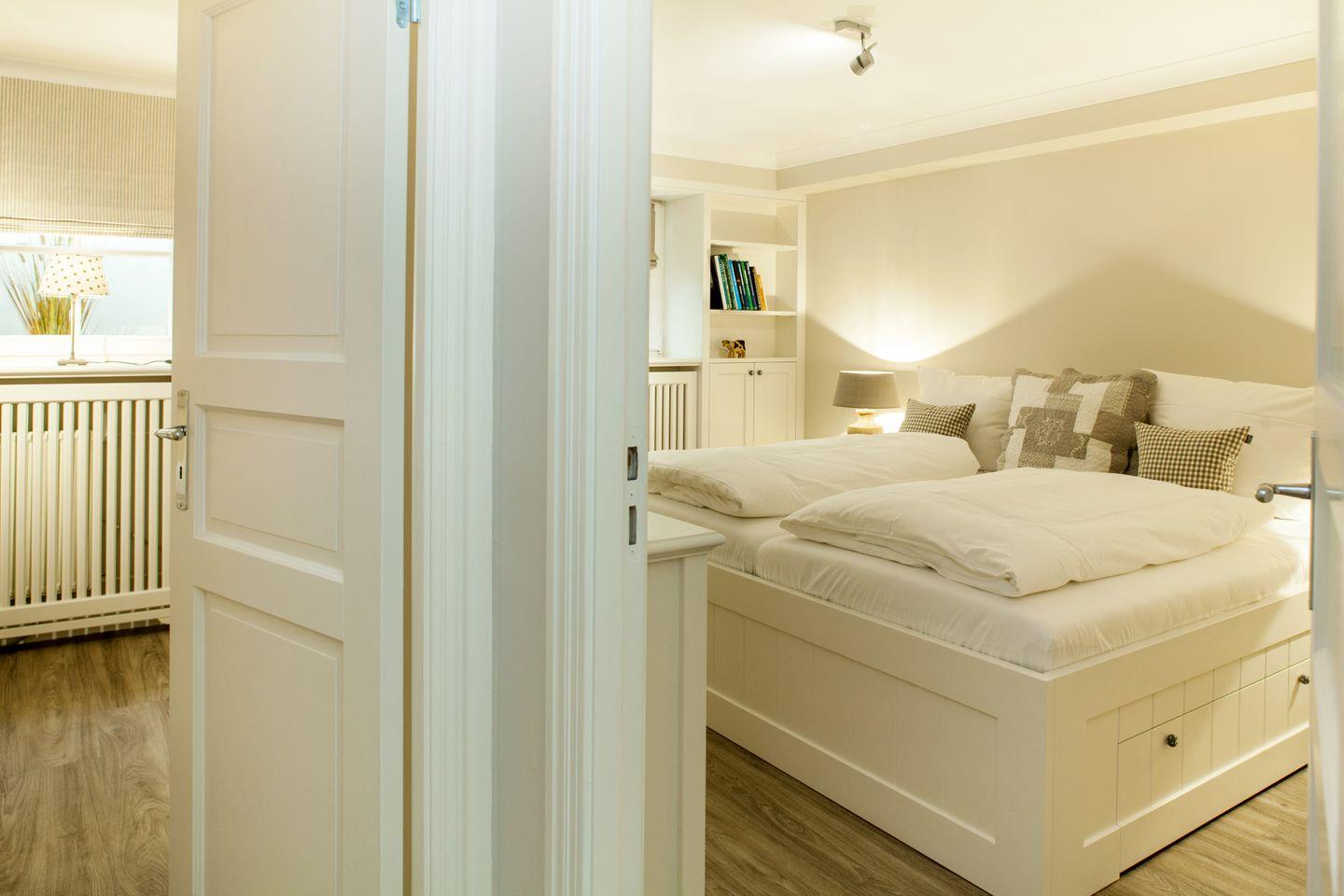 Schlafen 1: großzügiges Schlafzimmer mit Doppelbett (2 Matratzen je 90x200 cm), kleinem Einbauschrank und Flat-TV