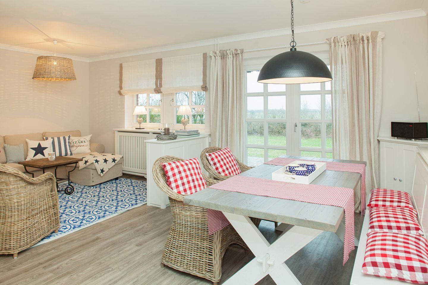 Wohn-/Essbereich: Wohnraum mit Sitzgarnitur (3er Couch mit Ottomane), einem Korbsessel und Flat-TV; Esstisch mit Sitzbank und zwei Korbsesseln