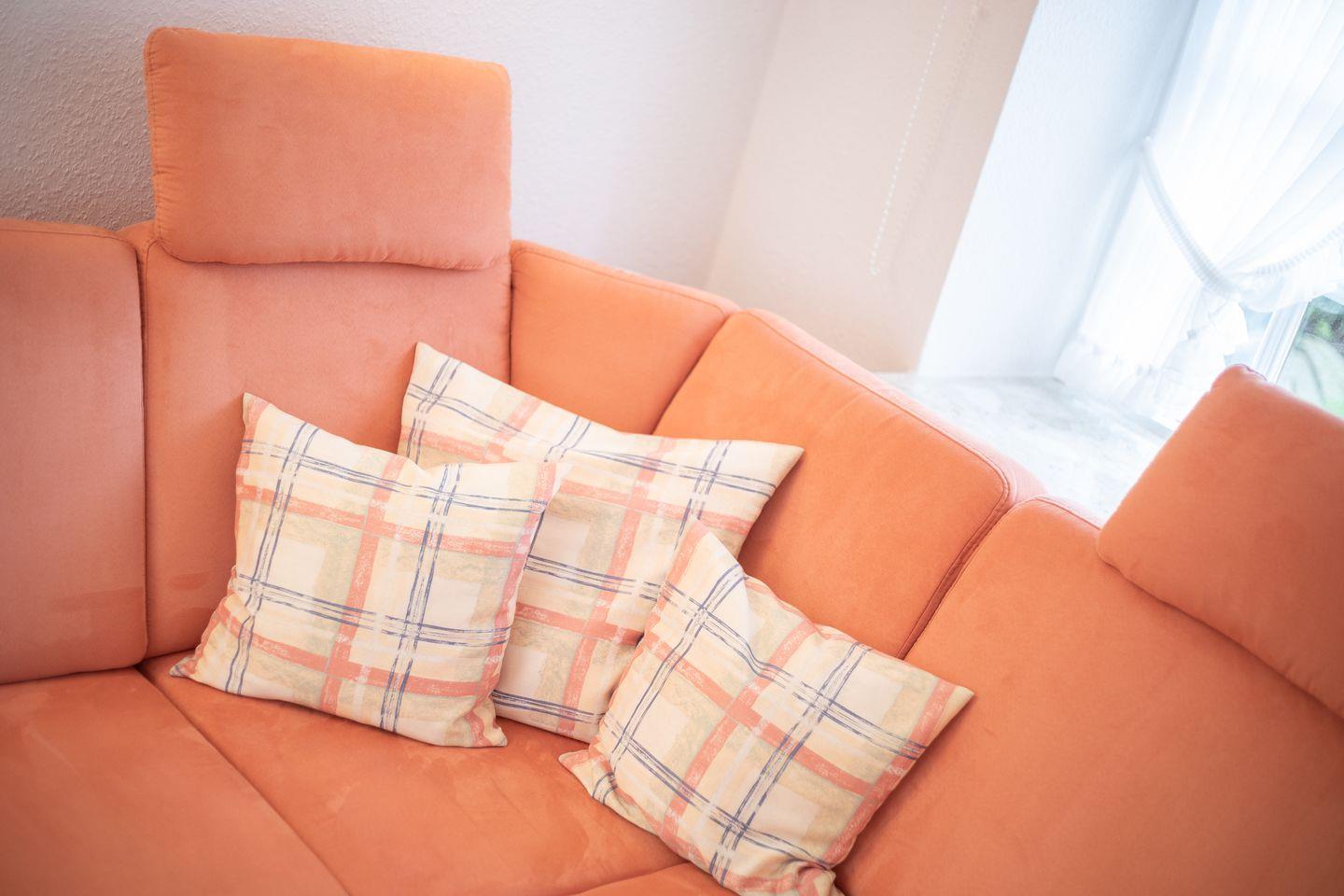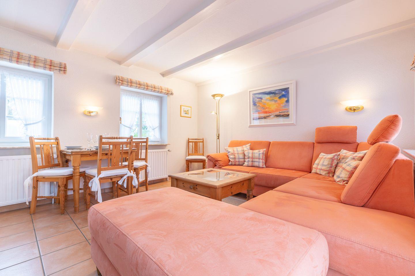 Wohn-/Essbereich: Wohnraum mit Sitzgruppe (zwei 2er Couchen und Fußhocker), Essecke mit 4 Stühlen