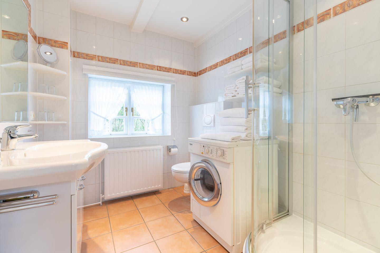 Bad: weißes Duschbad mit Waschmaschine