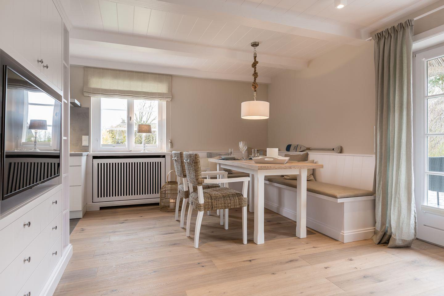 Wohn-/Essbereich: Wohnraum mit gemütlicher Eckcouch und Rattansessel; großzügiger Essbereich mit Eckbank, Tisch und zwei Rattanstühlen