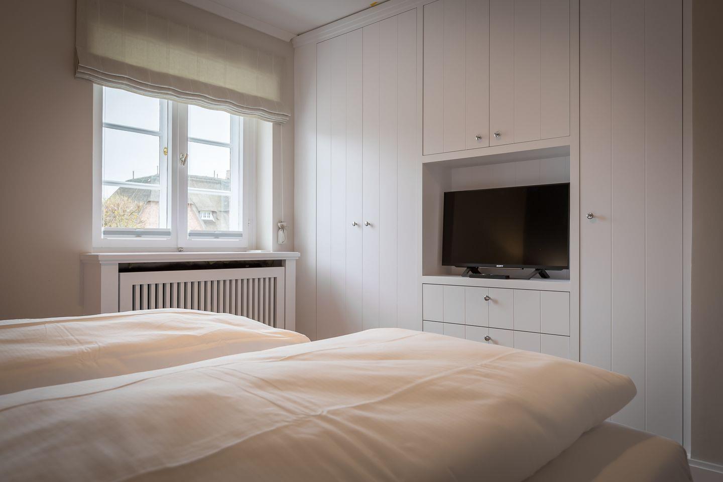 Schlafen: Schlafzimmer mit Boxspringbett, großem Einbauschrank und Flat-TV