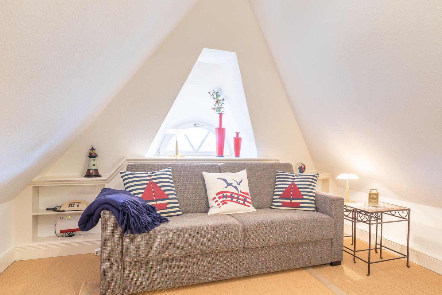 Die hier vorgestellte Ferienwohnung im Obergeschoß und ausgebautem Dachgeschoß in Südwestlage ist ca. 65 m² groß und bietet zwei (evtl. drei) Personen Platz.