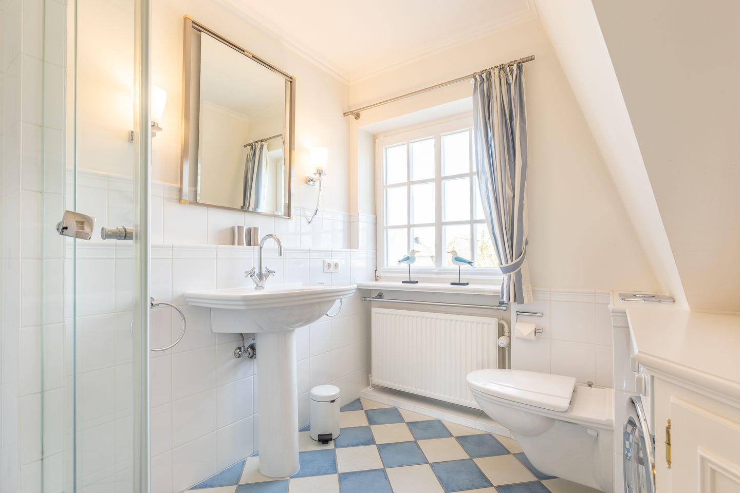 Bad: weiß/ blaues Duschbad mit Waschtrockner und Einbauten