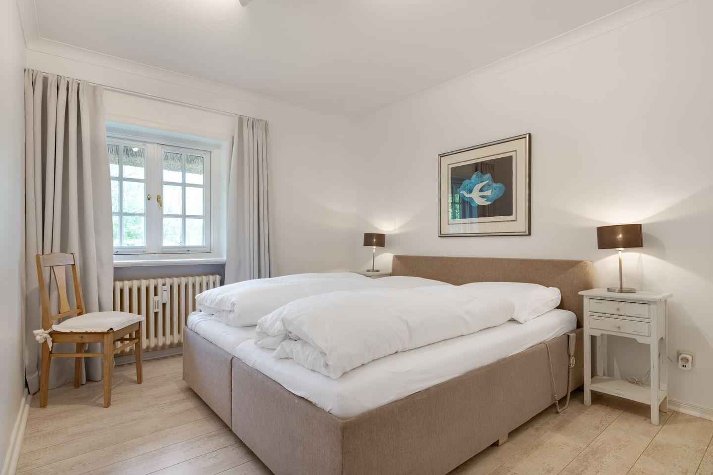 Schlafen: geräumiger Schlafraum mit elektrisch verstellbarem Doppelbett (2 Matratzen á 90 x 200 cm) ohne Fußende und Einbauschrank
