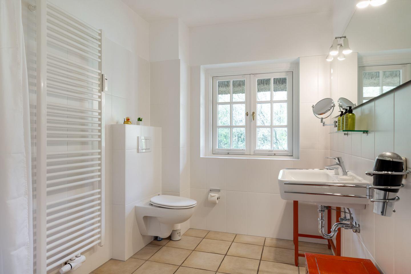 Badezimmer: weißes Bad mit ebenerdiger Dusche, Handtuchhalter, Kosmetikspiegel und Fön