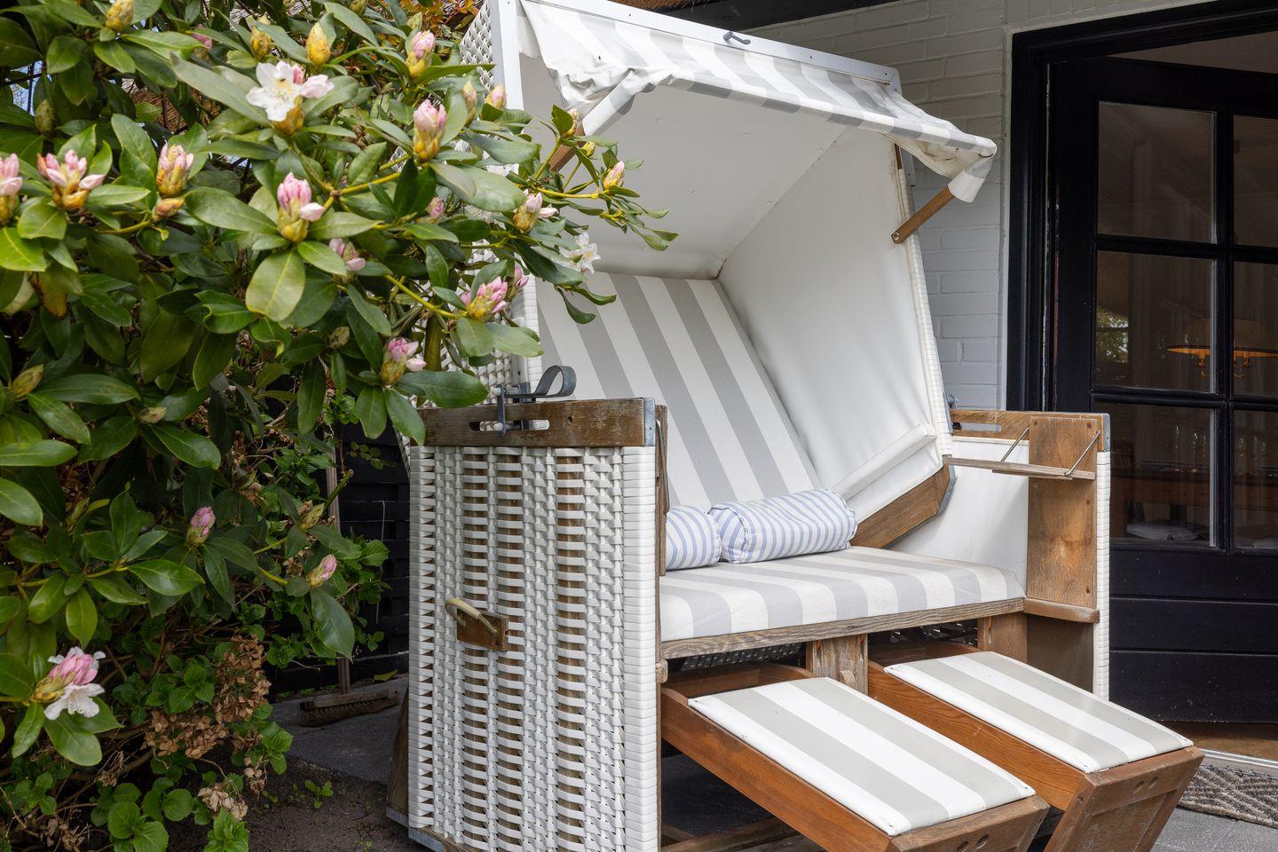 Terrasse: Süd-Terrasse mit kleinem Garten, Friesenbank und Strandkorb ( von ca. April - Oktober)