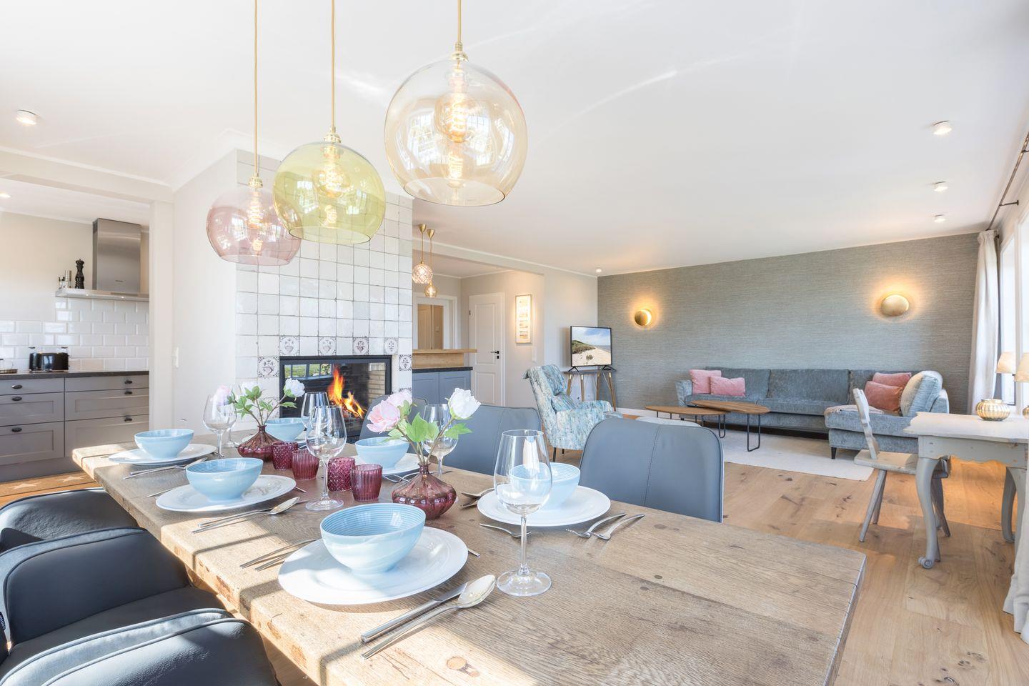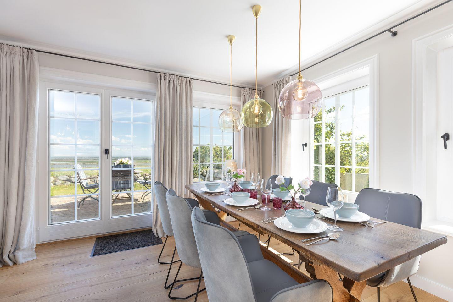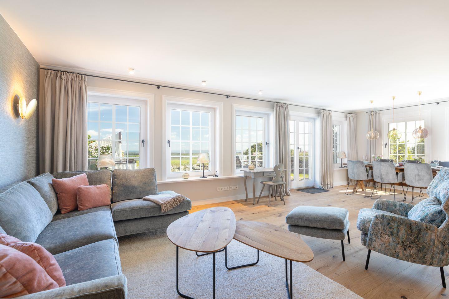 Wohn-/Essbereich: großer, heller Raum mit Dielenboden, offenem Kamin und traumhaftem Blick über das Wattenmeer, großzügige Couch mit Flat-TV; Essbereich mit großem Tisch und sechs Stühlen.