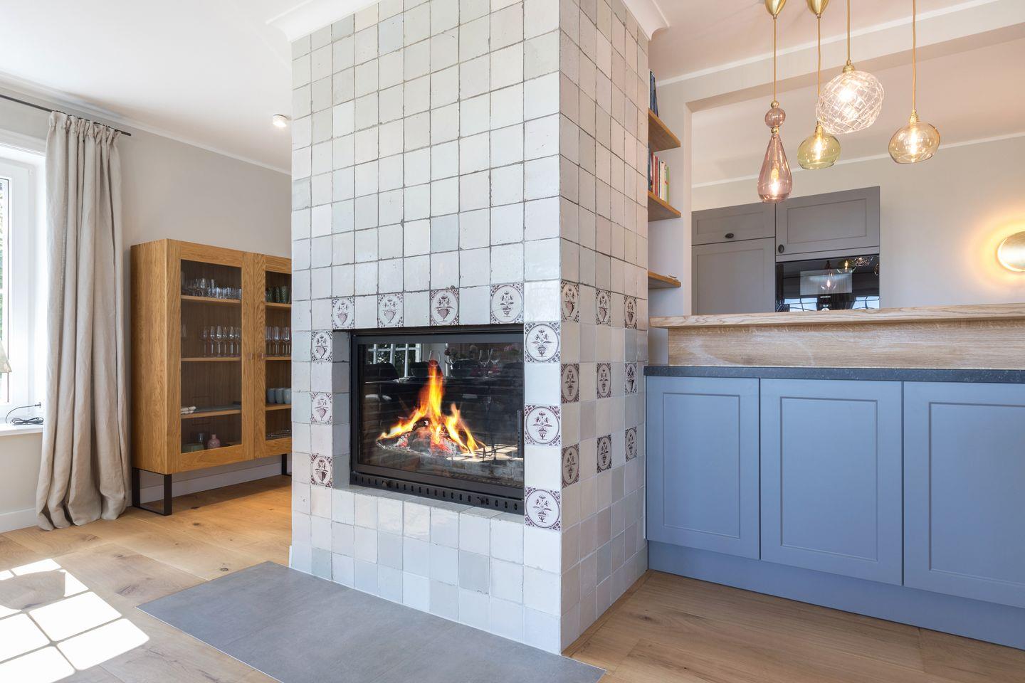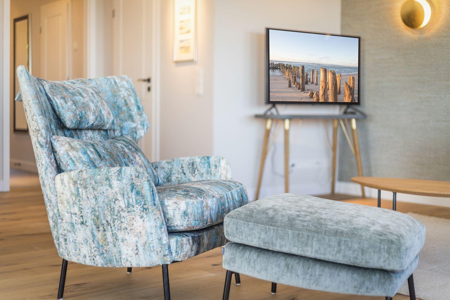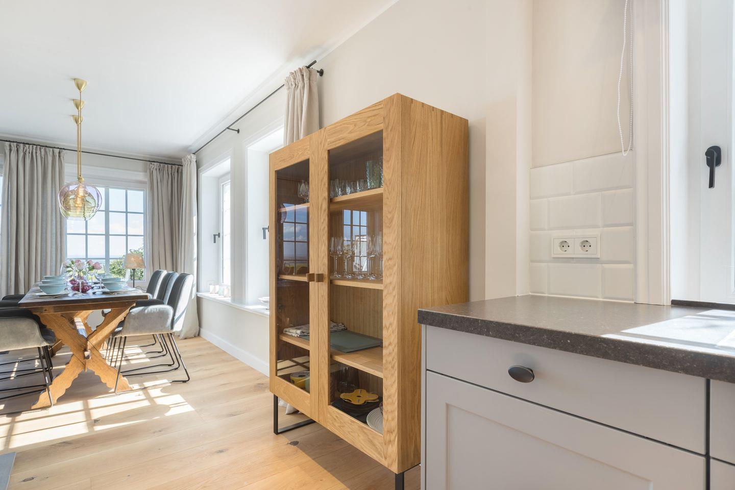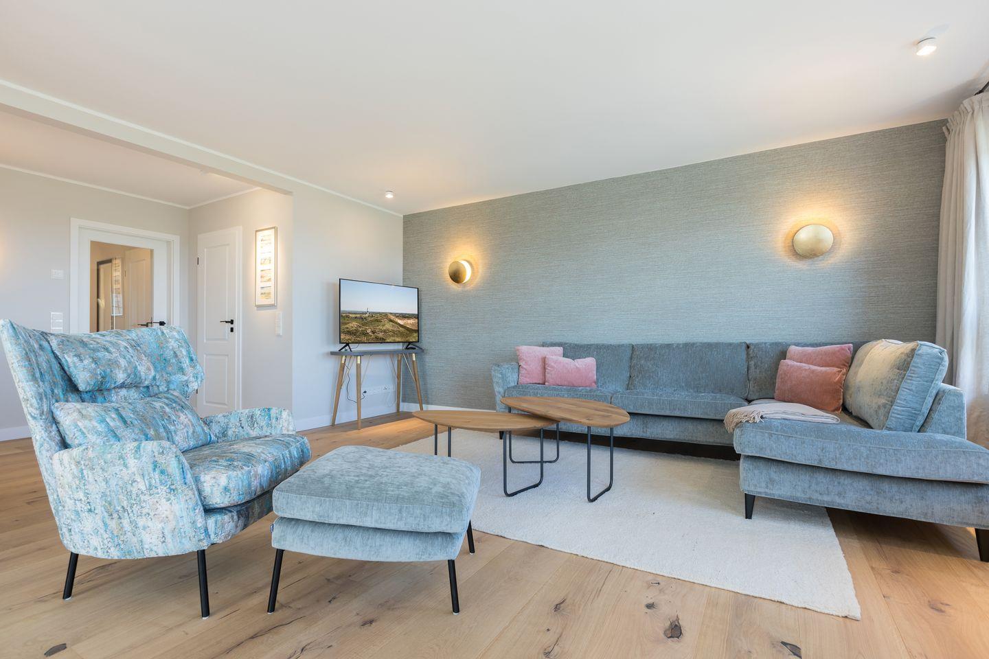 Wohn-/Essbereich: großer, heller Raum mit Dielenboden, offenem Kamin und traumhaftem Blick über das Wattenmeer, großzügige Couch mit Flat-TV; Essbereich mit großem Tisch und sechs Stühlen.