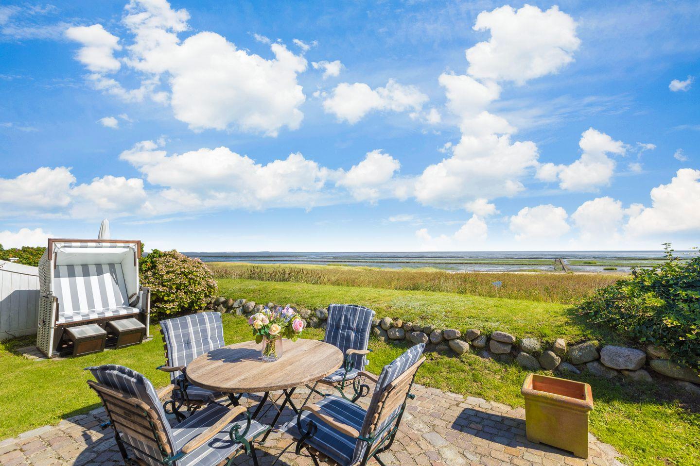 Terrasse: kleine Terrasse mit Gartengestühl ( April bis Oktober ) und Strandkorb ( von April bis Oktober ) mit traumhaften Blick über das Wattenmeer