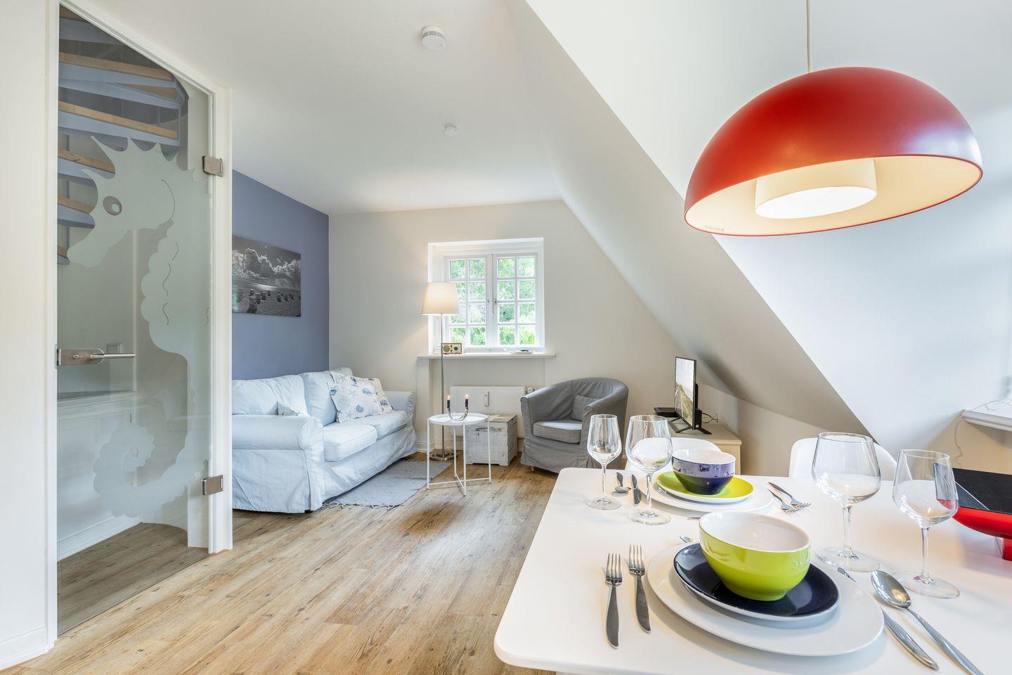 Die hier vorgestellte Ferienwohnung im Obergeschoss in Südlage ist ca. 45 m² groß und bietet bis zu zwei Personen Platz. Das reetgedeckte Haus liegt nur wenige Gehminuten vom Wattenmeer, einem Lebensmittelmarkt und einer Bäckerei entfernt. Modern und farbenfroh empfängt Sie diese Wohnung und verfügt über Komfort wie Flat-TV, W-Lan, Blue-Ray-Player, Radio mit Bluetooth, Induktionsherd, Backofen, Geschirrspüler und Nespresso-Kaffeemaschine (ohne Kapseln). Zur Wohnung gehören ein Pkw-Stellplatz und ein Gartenplatz mit Saisonstrandkorb ( ca. April - Oktober )