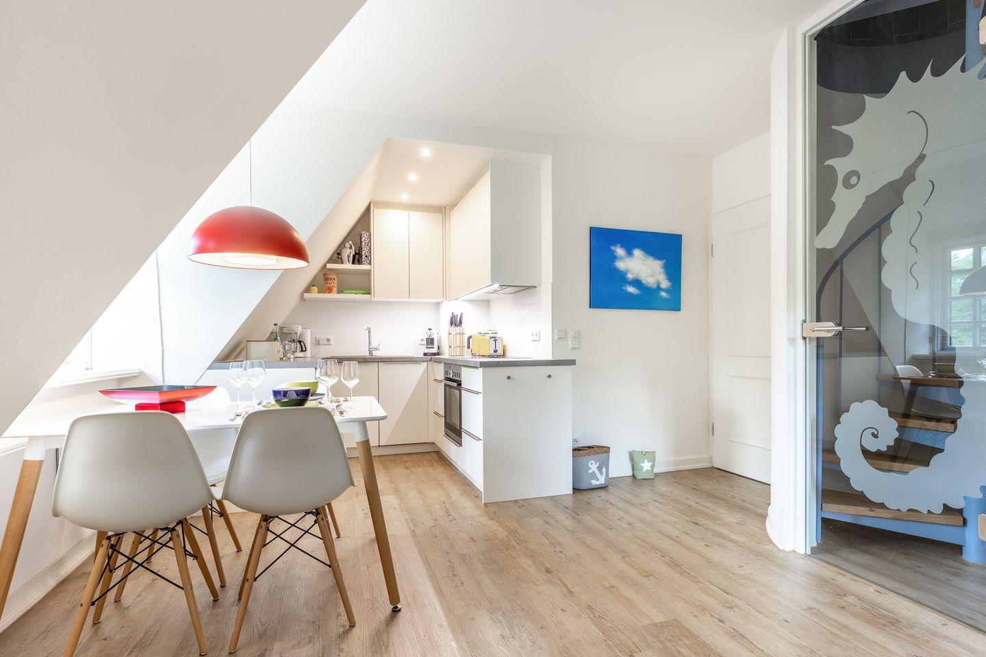 Küche: kleine offene Einbauküche mit Geschirrspüler, Backofen, Nespresso-Kaffeemaschine etc.