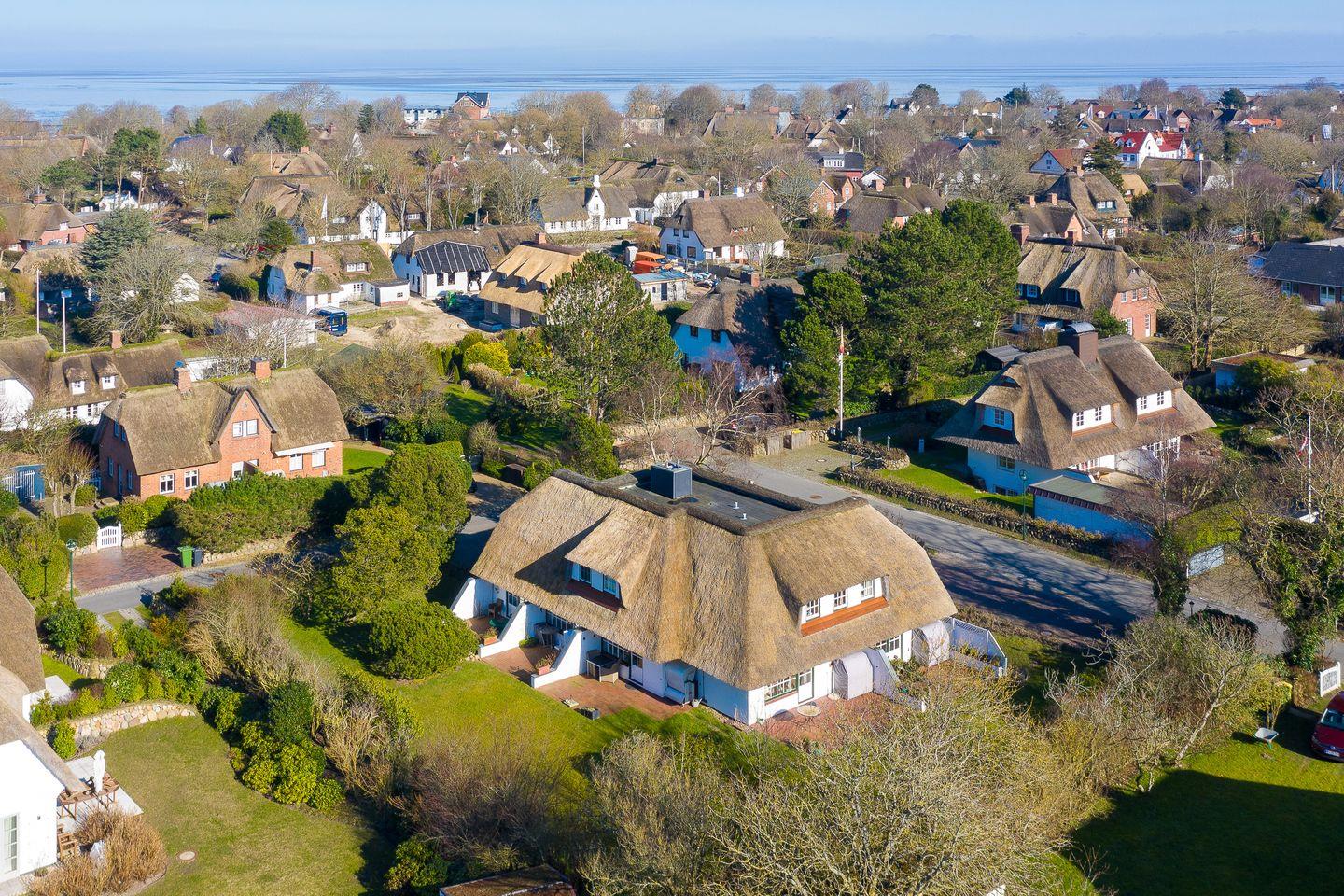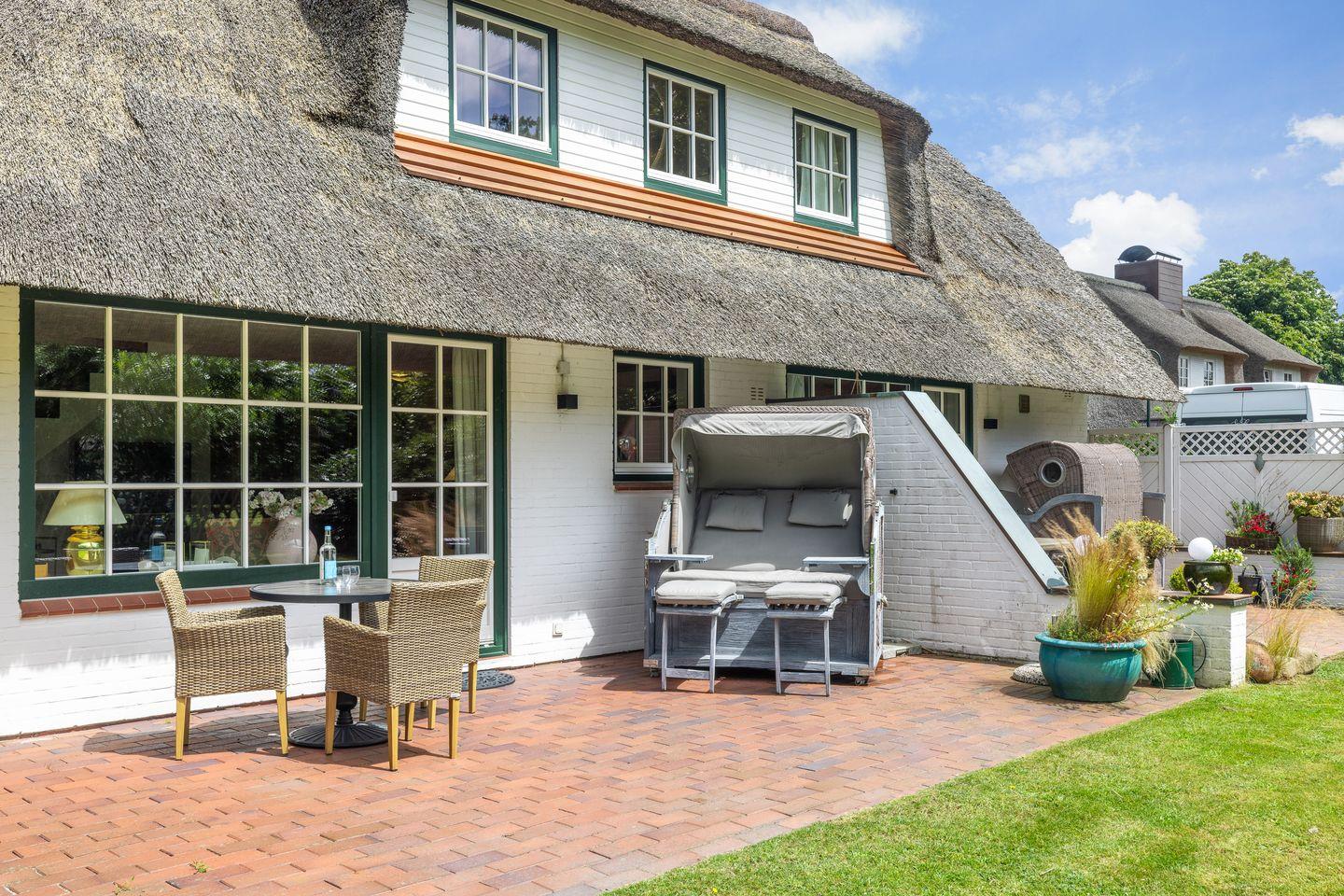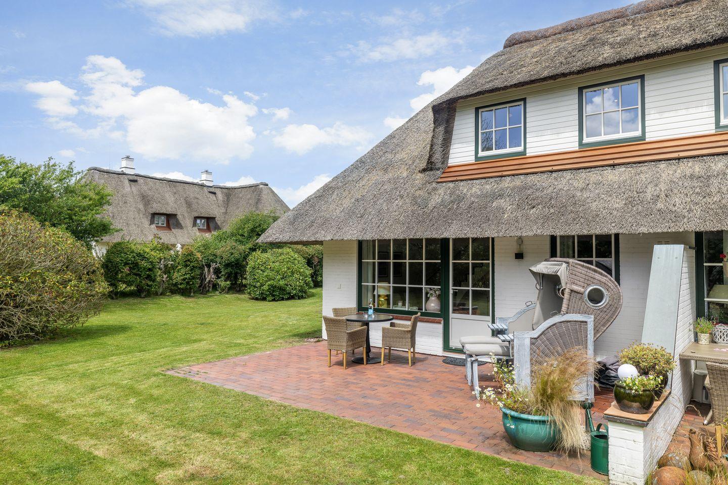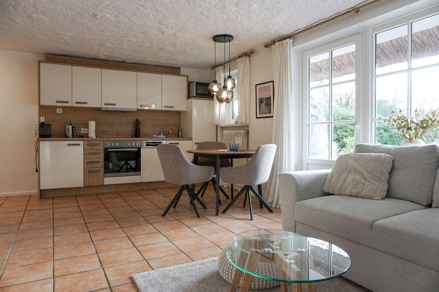 Dieses 50qm große Domizil unter Reet, liegt in einer ruhigen Seitenstraße in Keitum. Der offenen Wohnbereich mit einer Küchenzeile ( Induktionskochfeld, Geschirrspüler, Backofen, Mikrowelle), einem Esstisch für 3 Personen und der Sitzecke (Schlafsofa 140x200 cm) mit Fernseher (Smart-TV mit Magenta) und zwei Alexa Geräten, verfügt über eine große Fensterfront zur Terrasse. Die Terrasse bietet genügend Platz für einen Strandkorb und Gartenmöbel ( April - Oktober ) und ist nach Süden ausgerichtet.