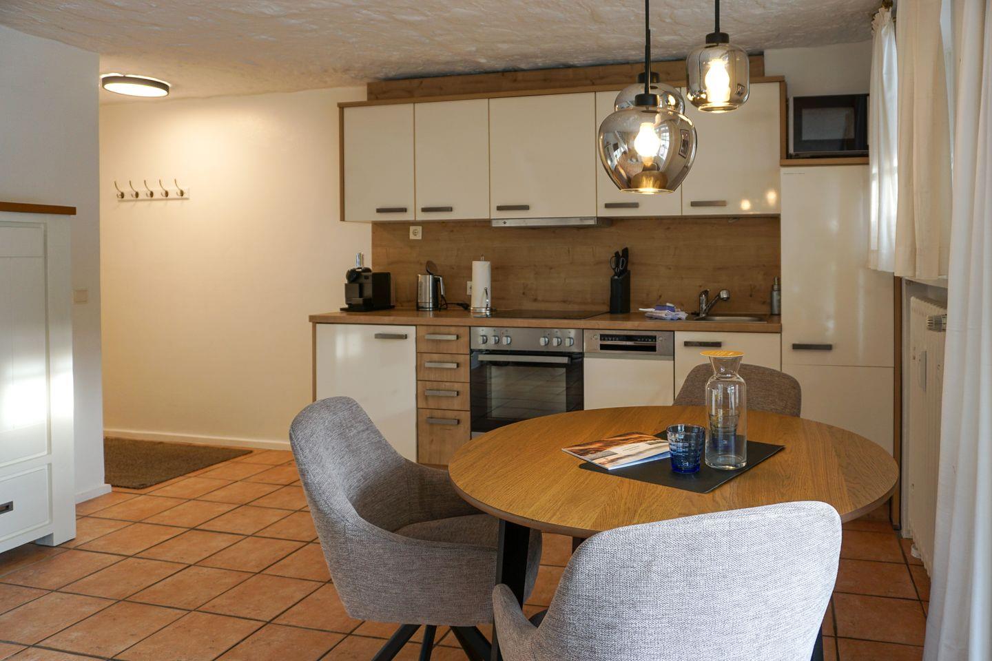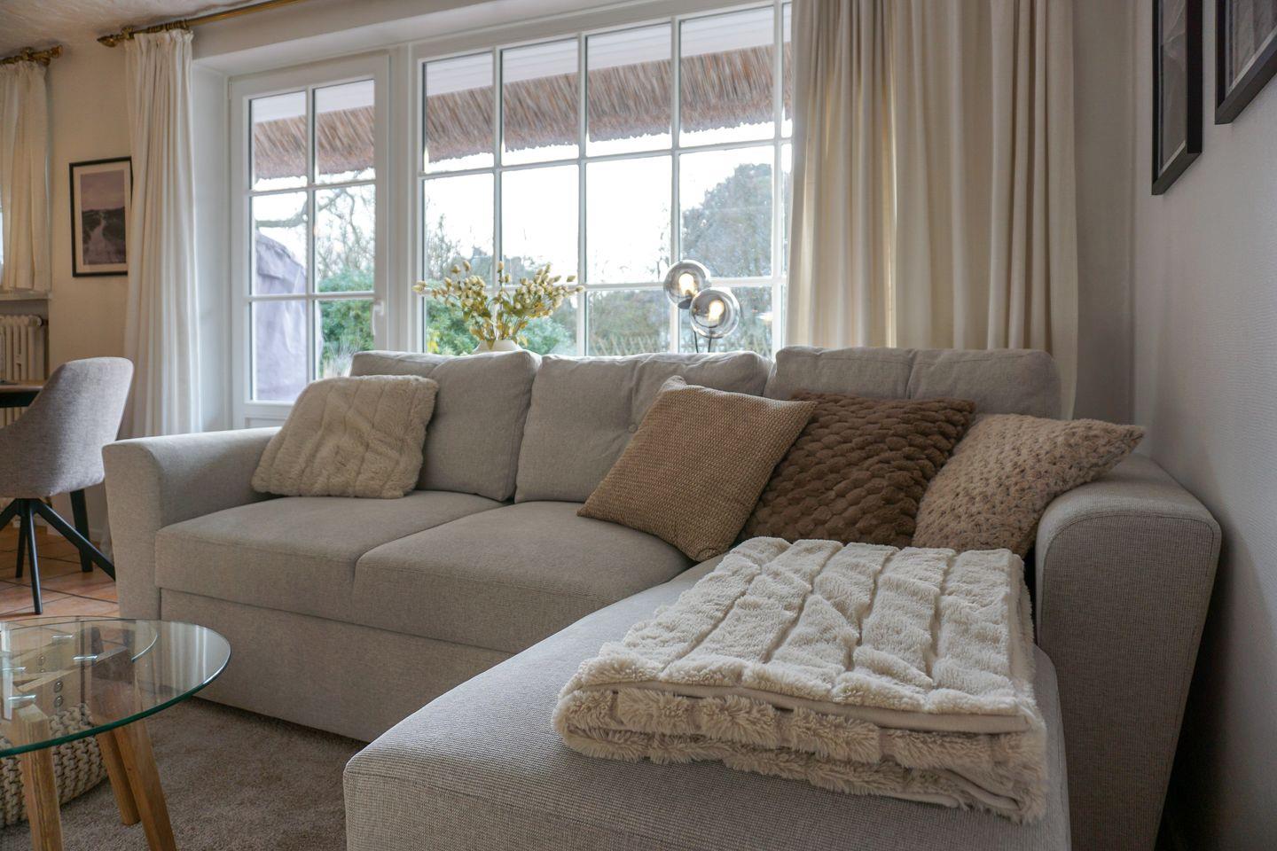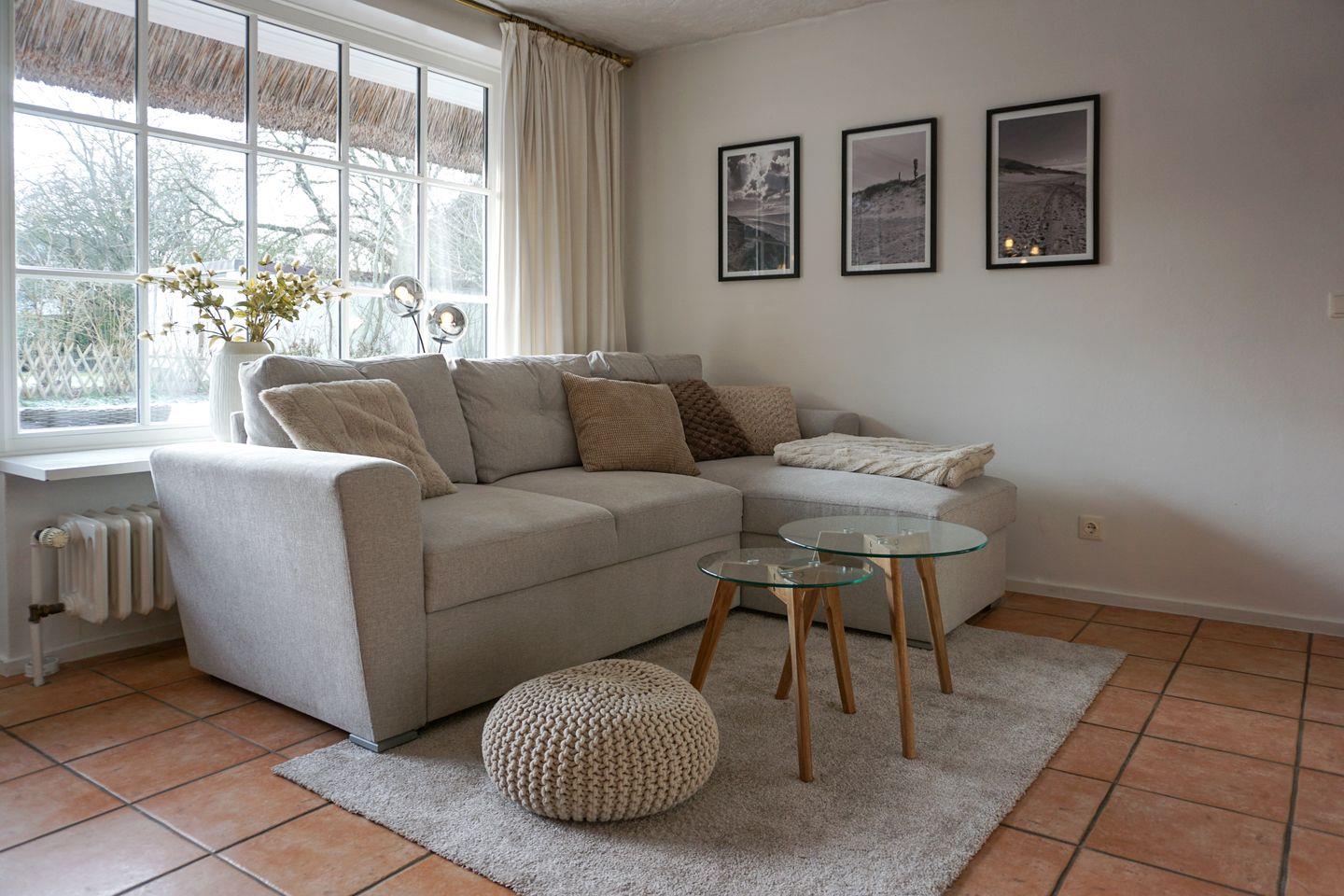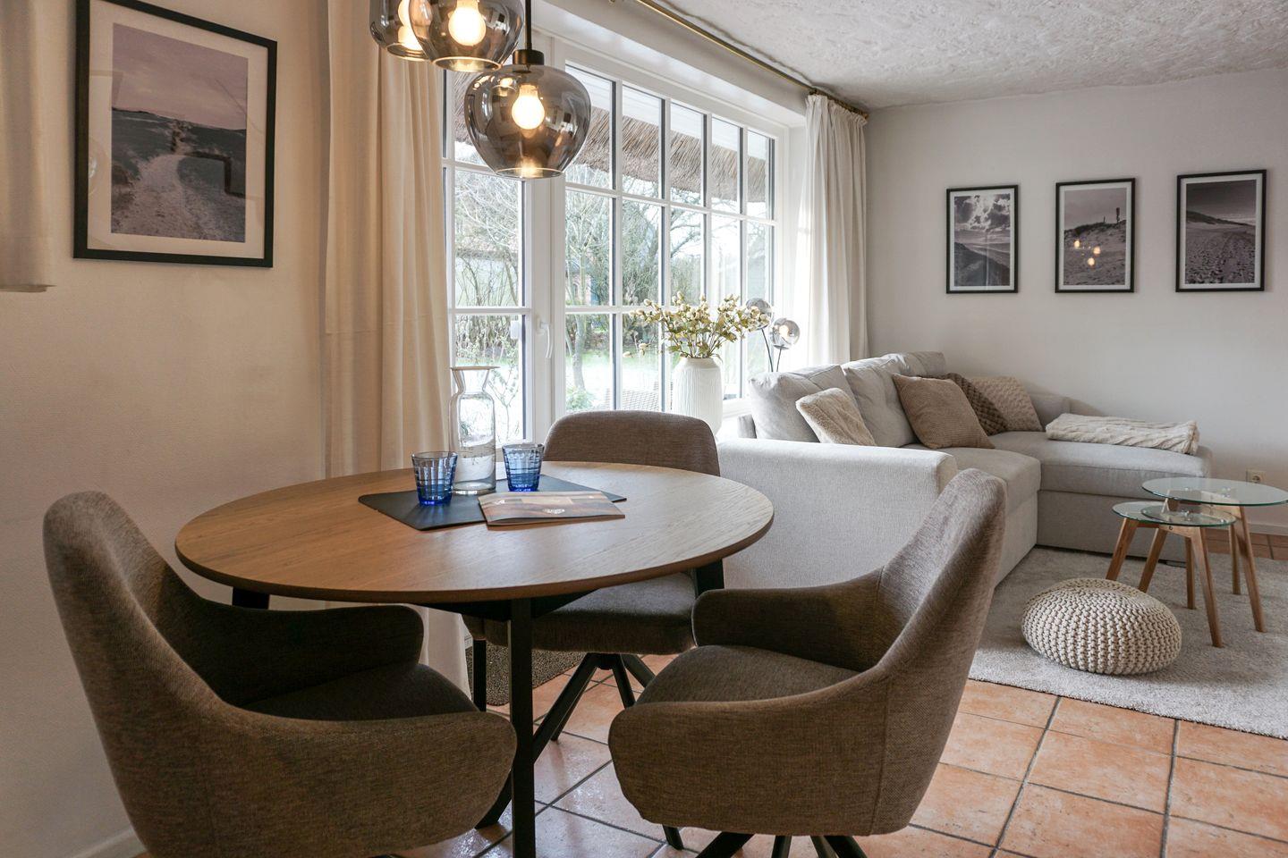 Dieses 50qm große Domizil unter Reet, liegt in einer ruhigen Seitenstraße in Keitum. Der offenen Wohnbereich mit einer Küchenzeile ( Induktionskochfeld, Geschirrspüler, Backofen, Mikrowelle), einem Esstisch für 3 Personen und der Sitzecke (Schlafsofa 140x200 cm) mit Fernseher (Smart-TV mit Magenta) und zwei Alexa Geräten, verfügt über eine große Fensterfront zur Terrasse. Die Terrasse bietet genügend Platz für einen Strandkorb und Gartenmöbel ( April - Oktober ) und ist nach Süden ausgerichtet.