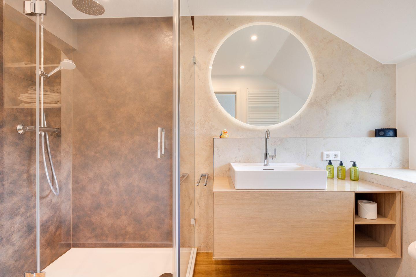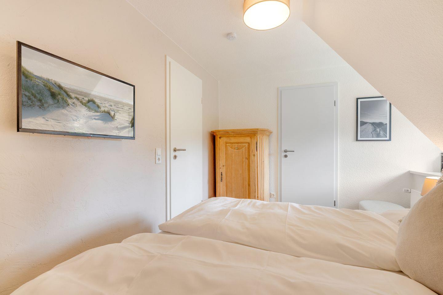 Vom Wohnbereich gelangt man über eine Treppe in das Dachgeschoß. Hier ist ein kleines Schlafzimmer mit zwei zusammen stehenden Einzelbetten ( können nicht auseinander geschoben werden ) und einem Fernseher. Das Bad wird über das Schlafzimmer betreten und verfügt über Dusche, WC und ein Fenster.