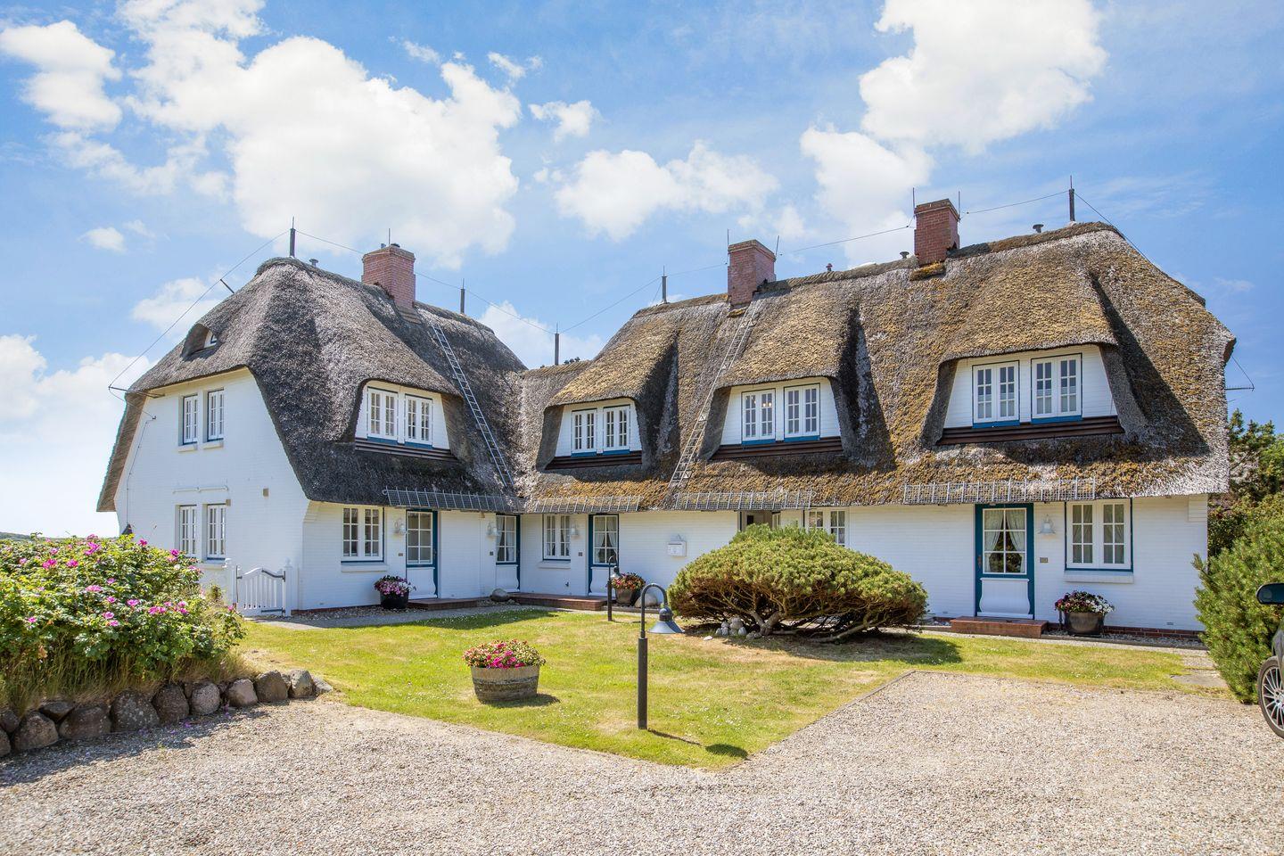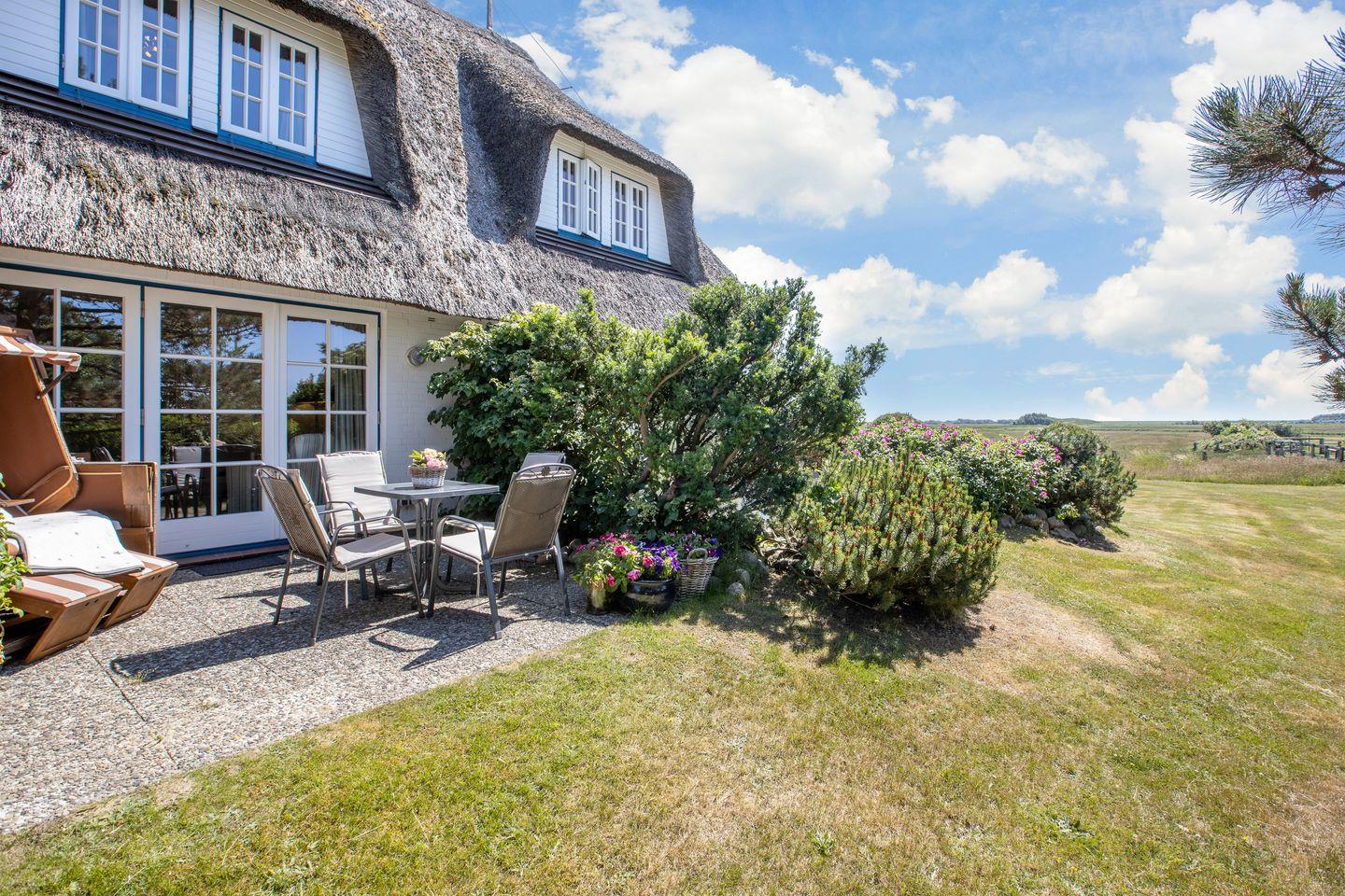Das reetgedeckte Haus liegt im Süden von Keitum in Richtung Wiesen und Deich.