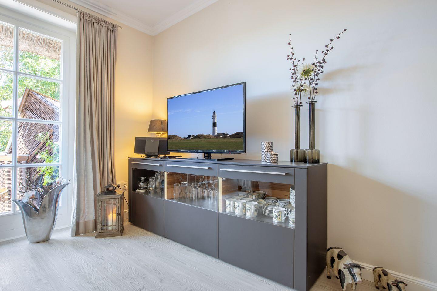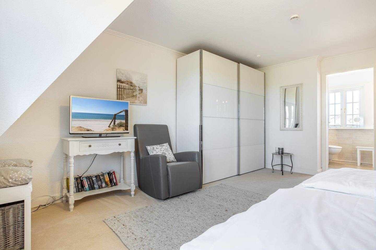 Schafen 1: geräumiges, offenes Schlafzimmer mit Doppelbett (ohne Fußteil) und ein 2. TV, Kleiderschrank und Sessel