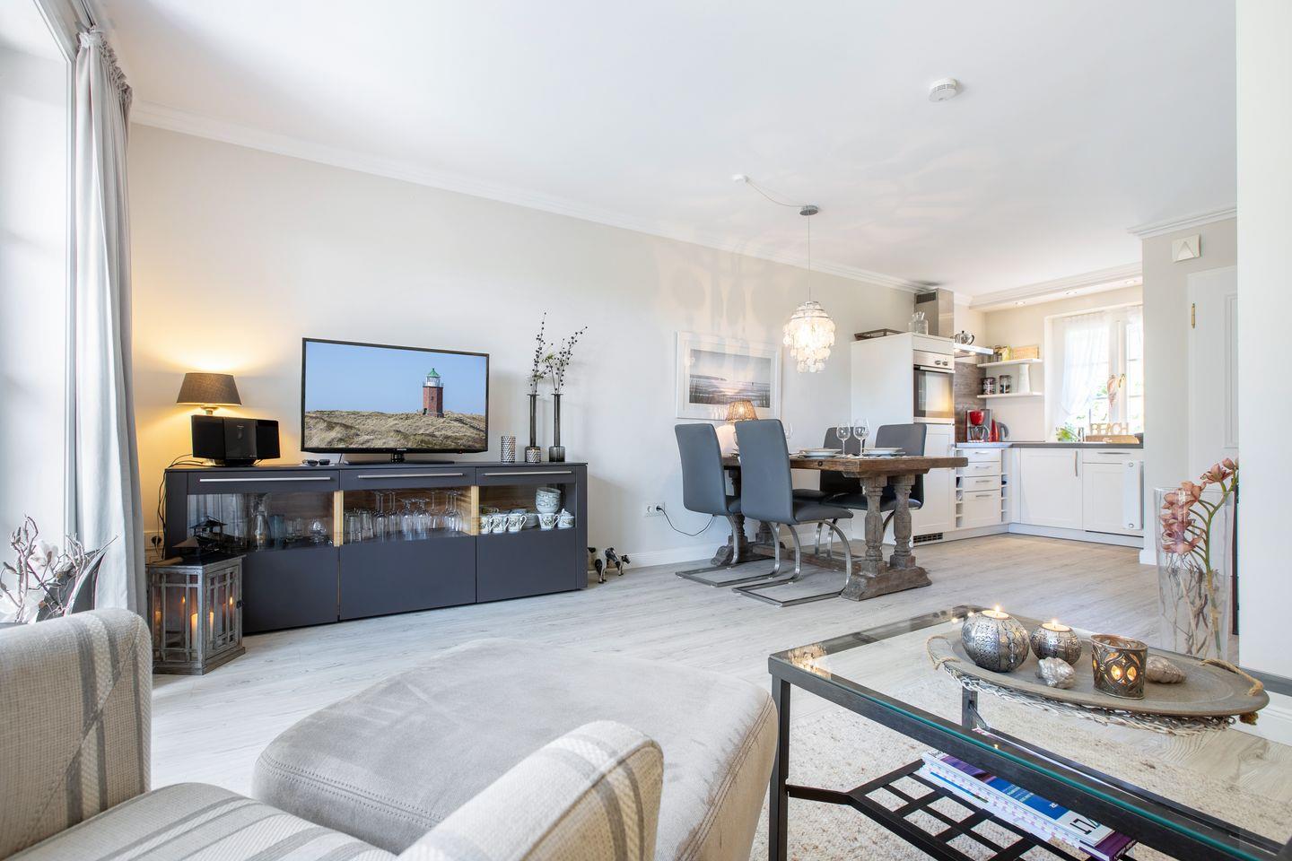Wohn-/Essbereich: Wohnraum mit offener Küche, Sitzgruppe mit 2er Couch, Sessel und Fußhocker, Essbereich mit 4 Stühlen