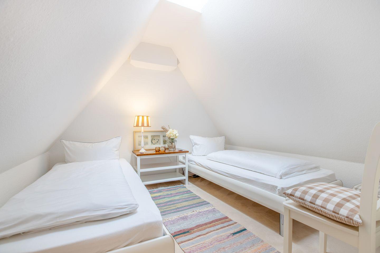 Vom Schlafzimmer im OG geht eine offene Treppe ins Dachgeschoss, hier befindet sich ein weiterer Raum mit zwei Einzelbetten (ohne Fußteil) unter Schrägen und kleinem Einbauschrank