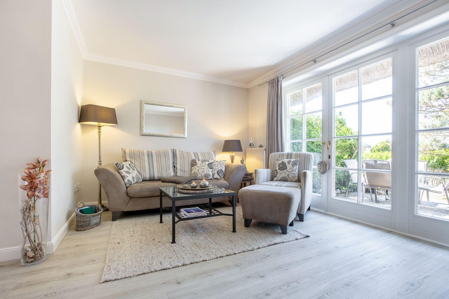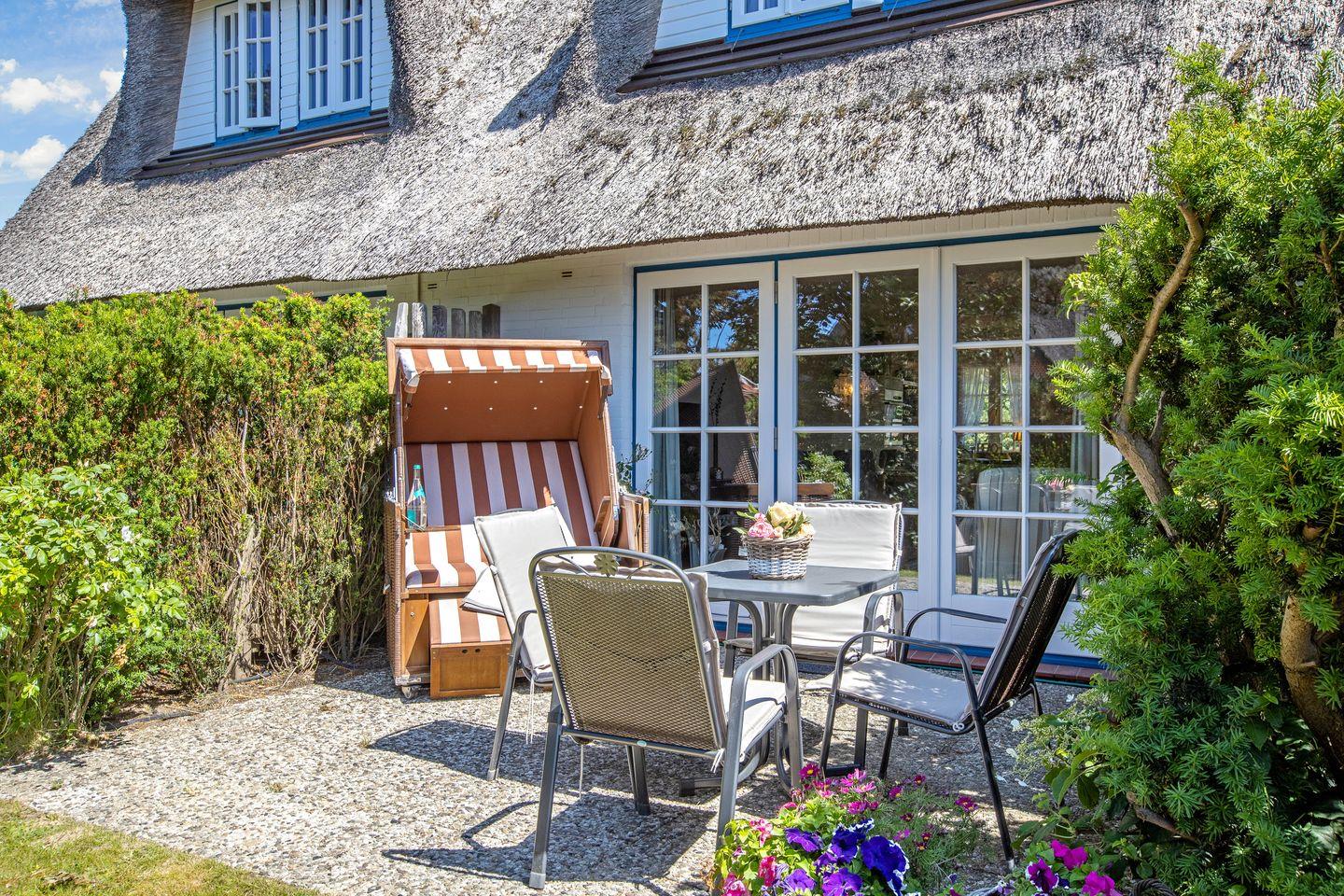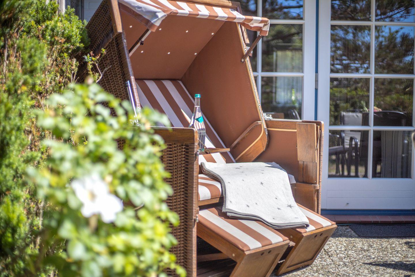 Terrasse: Terrasse mit Strandkorb und Gartengestühl zum Westen ( ca. April bis Oktober )