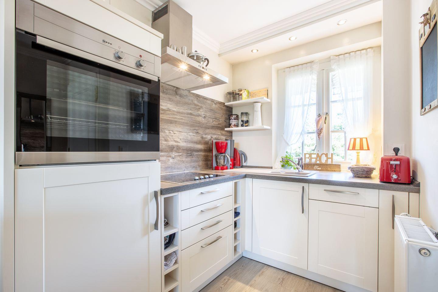 Küche: offene Küchenzeile mit Geschirrspüler und Backofen