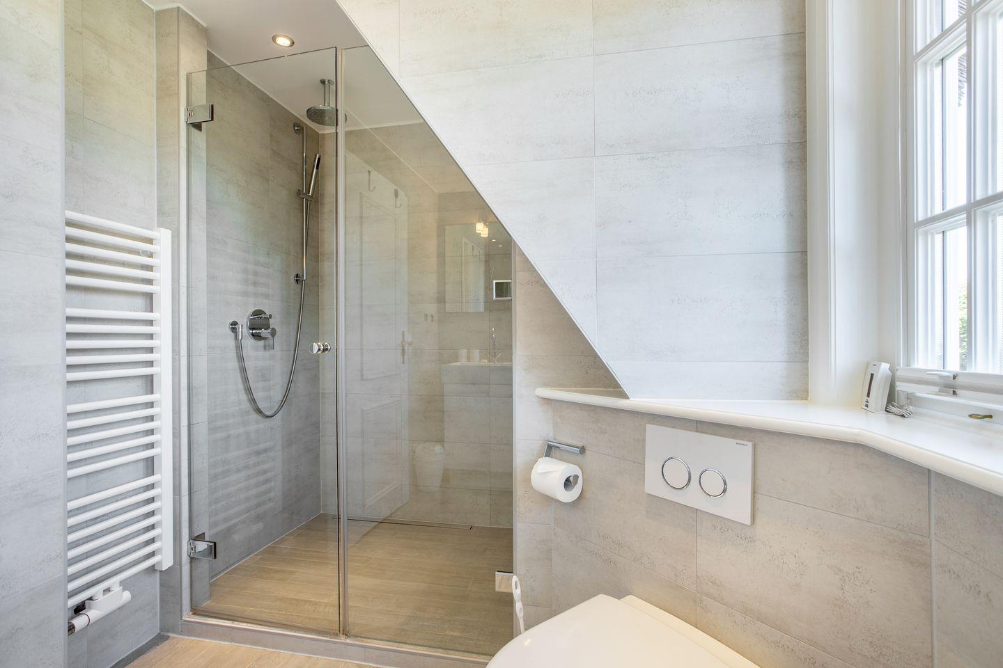 Badezimmer: helles, modernes Duschbad mit elektrischem Handtuchwärmer