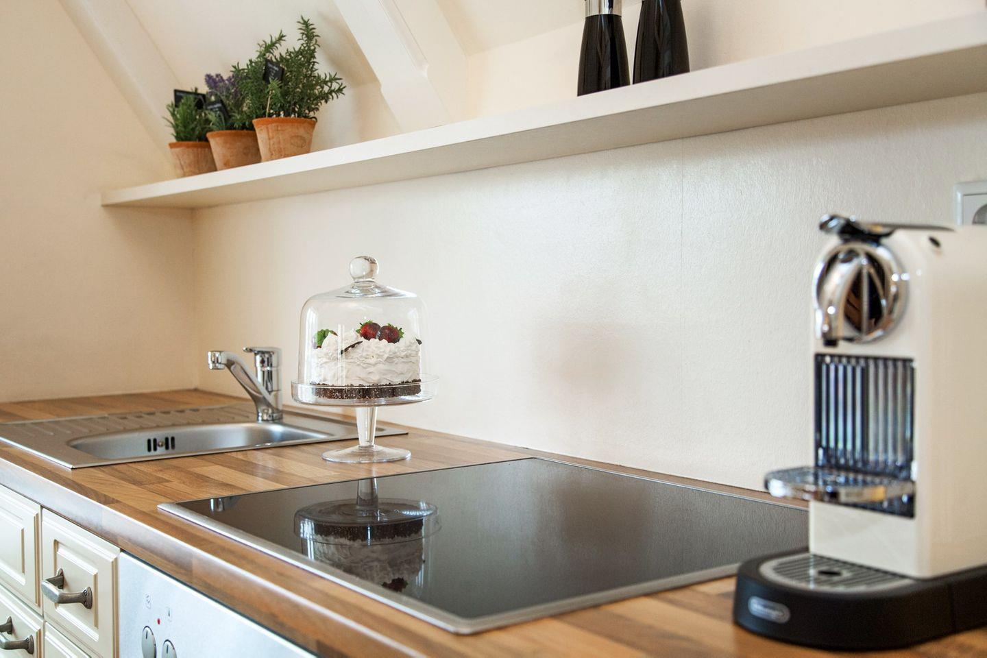 Küche: offene moderne Einbauküche mit Cerankochfeld, Geschirrspüler, Nespresso Kaffeemaschine etc.