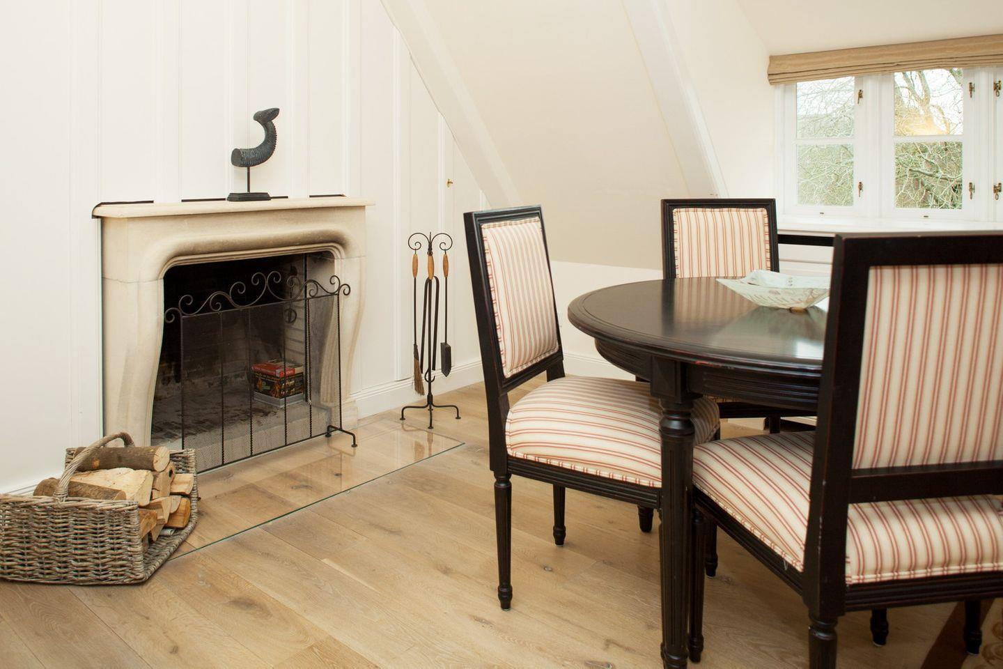 Wohn-/Essbereich: bequeme Sitzgruppe bestehend aus zwei großen Zweisitzer-Sofas und Flat-TV; runder Esstisch mit vier Stühlen am Kamin