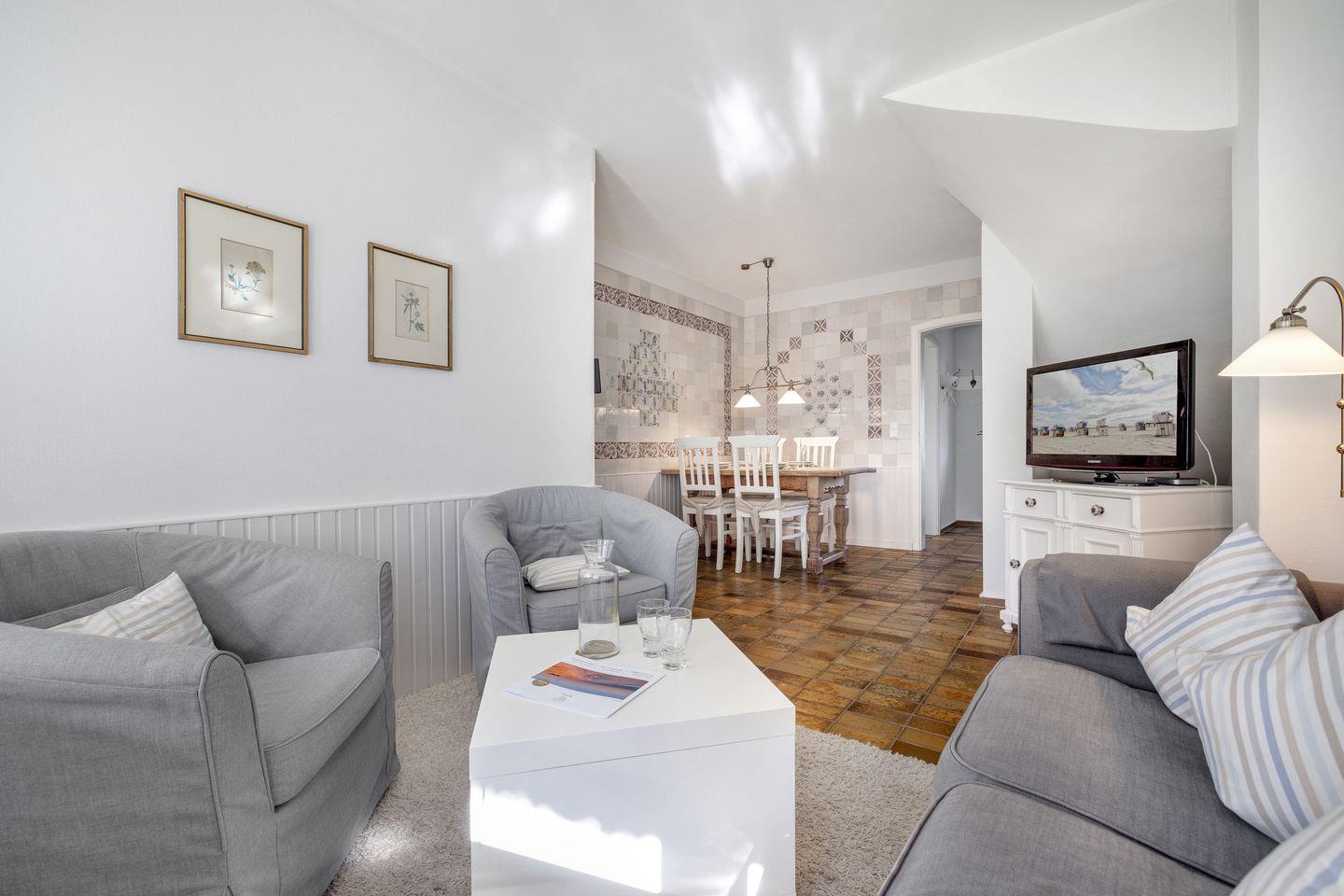 „Die Mittlere“ [nbsp]Wohnung bietet Platz für bis zu drei Personen und erstreckt sich über Erd- und Obergeschoss. Im Erdgeschoss finden Sie den freundlich eingerichteten Wohnbereich mit Sitz- und Essgruppe sowie eine separate Küche. Über eine Treppe vom Flur aus erreichen Sie im Obergeschoss ein Schlafzimmer mit zwei Einzelbetten und einen weiteren Schlafraum mit einem Bett (1,40m x 2,00m) sowie das Duschbad.
