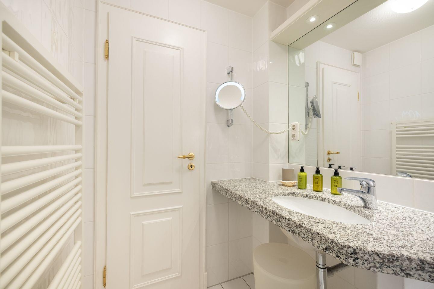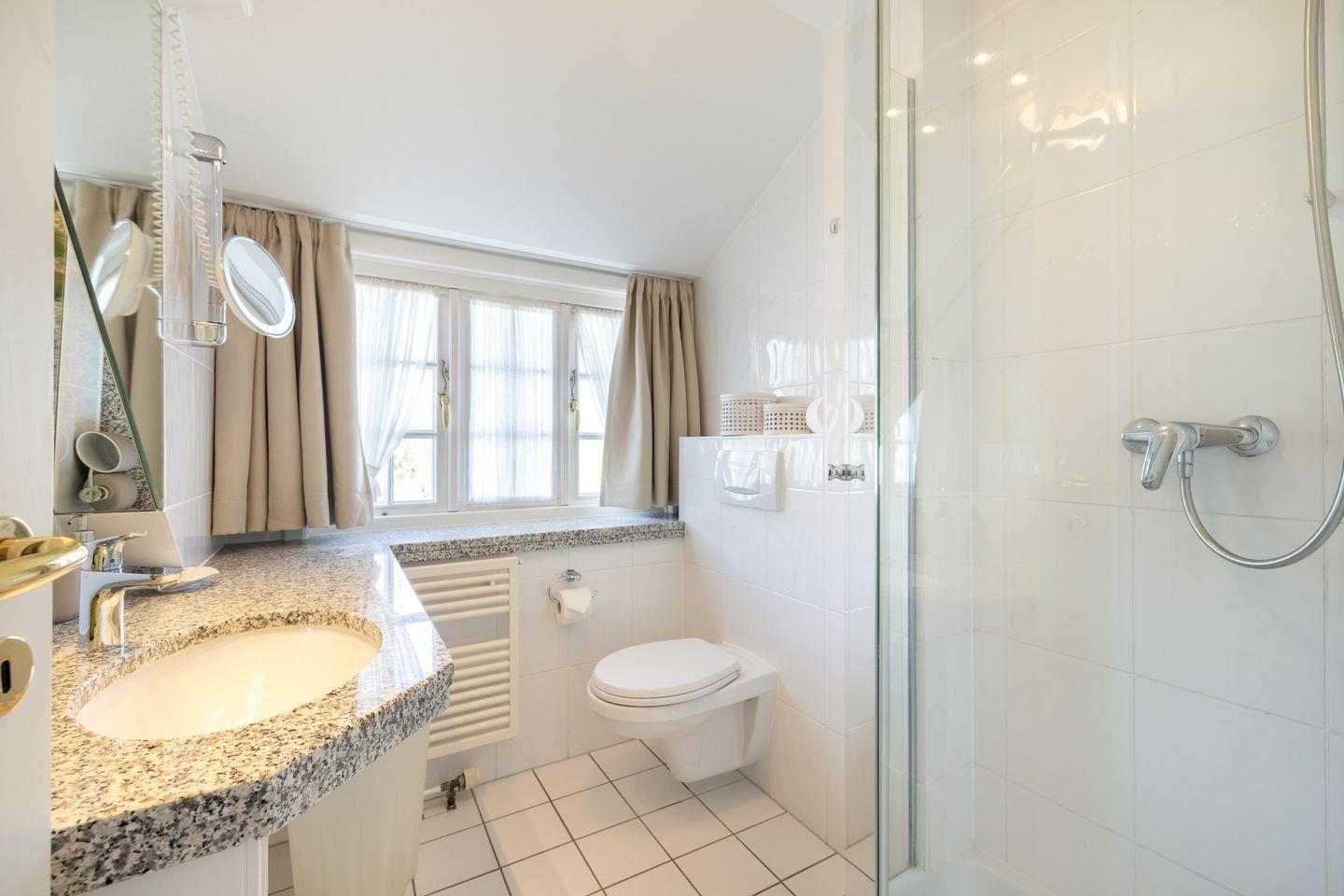 - 1 Badezimmer mit Dusche, WC und Schminkspiegel
