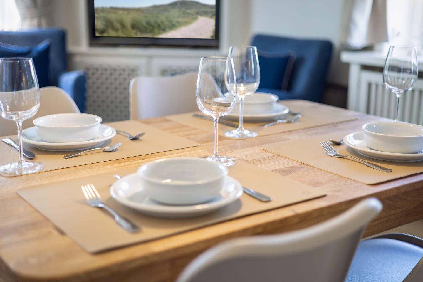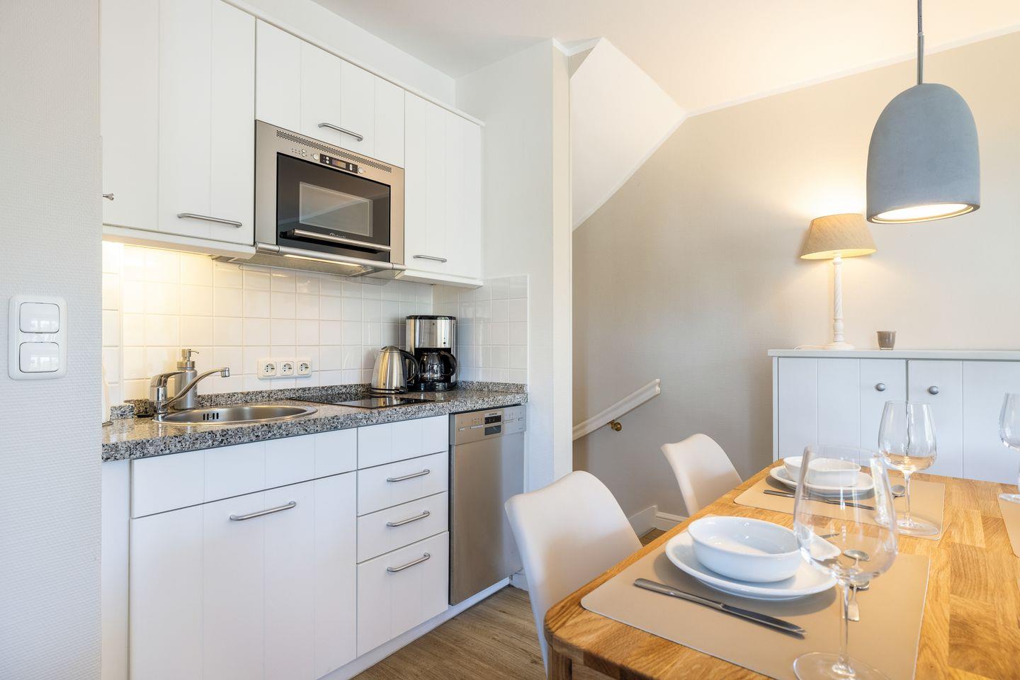 - Wohn- Essbereich mit kleine Küchenzeile mit Mikrowelle, Geschirrspüler, von hier aus haben Sie Zutritt zur Terrasse mit Gartengestühl (April bis Oktober) und der Sonnenkuhle mit einem Strandkorb ( Westlage)