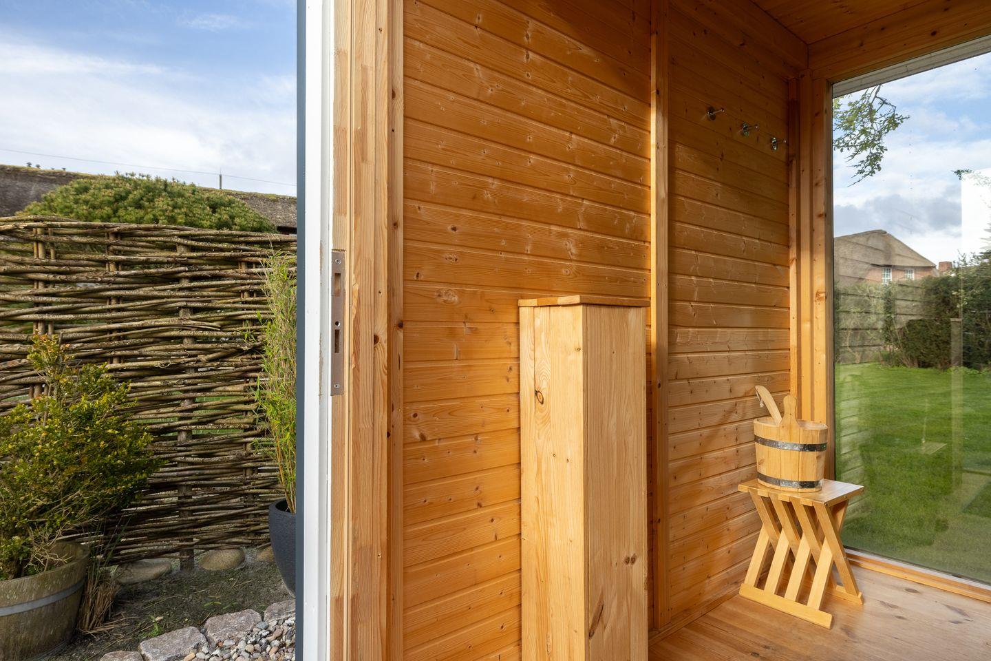 Im Holzhaus auf Ihrer Seite haben Sie die Möglichkeiten Fährräder unterzustellen. Die Sauna befindet sich im südlichen Gartenteil ( diese ist über die Straße erreichbar)
