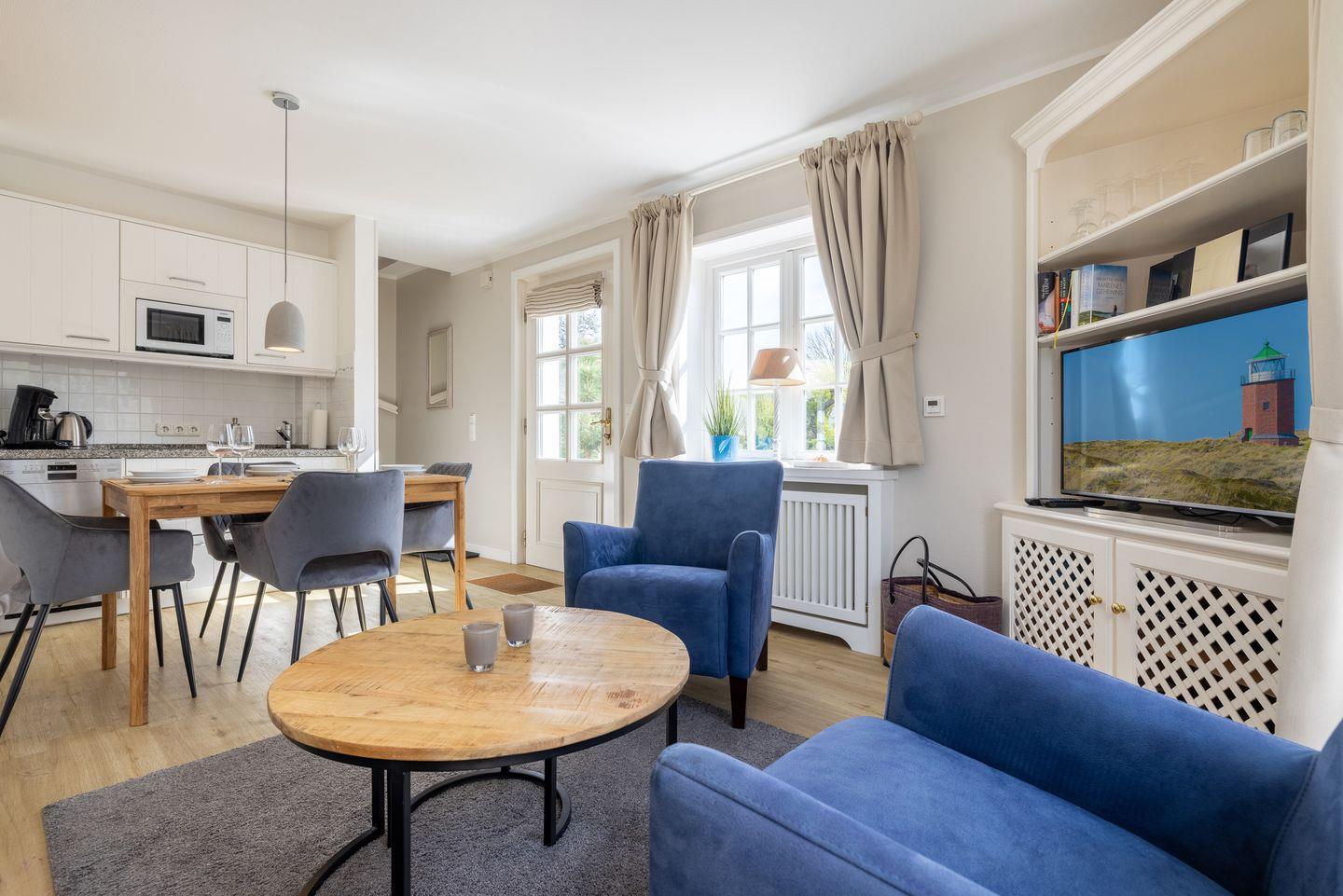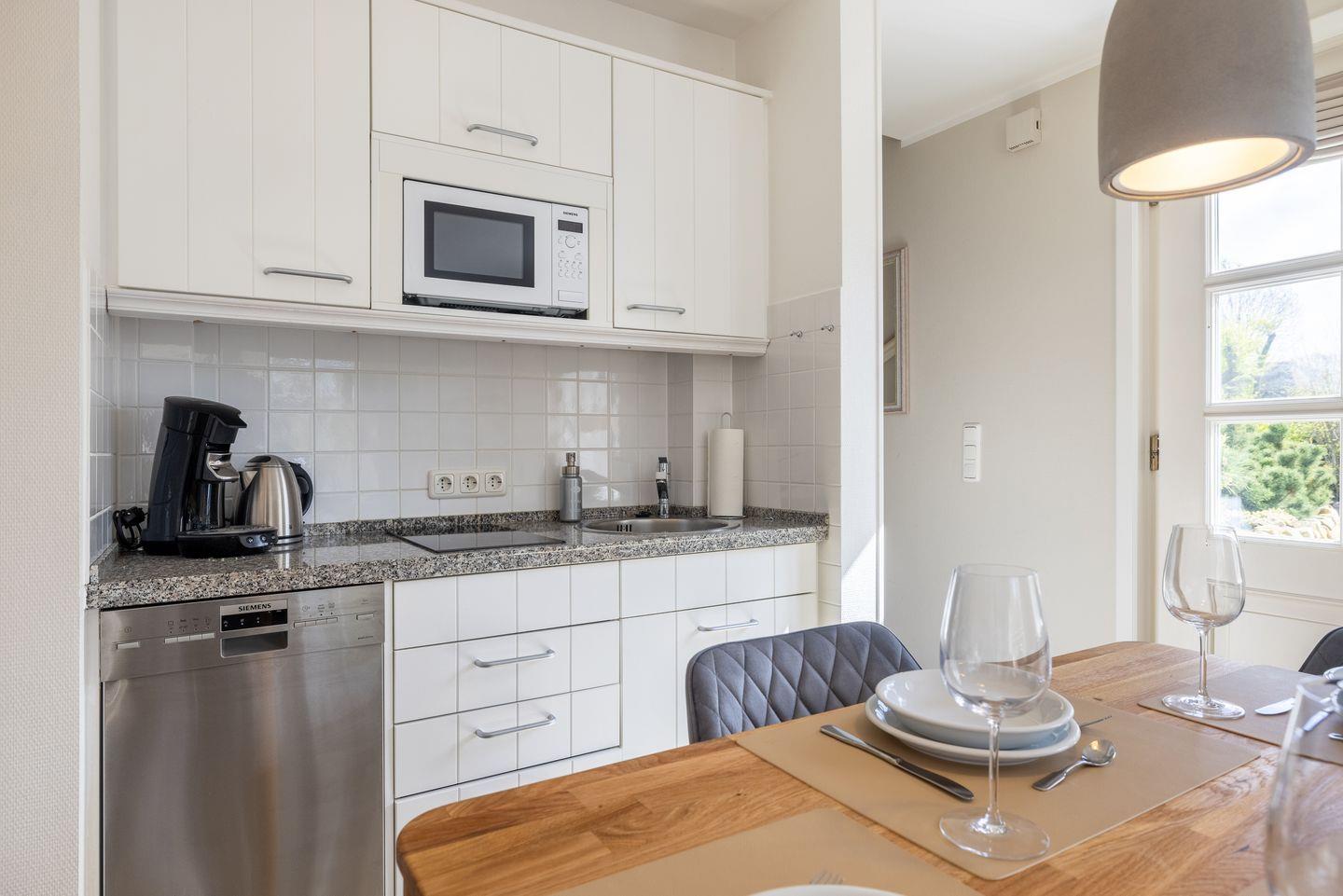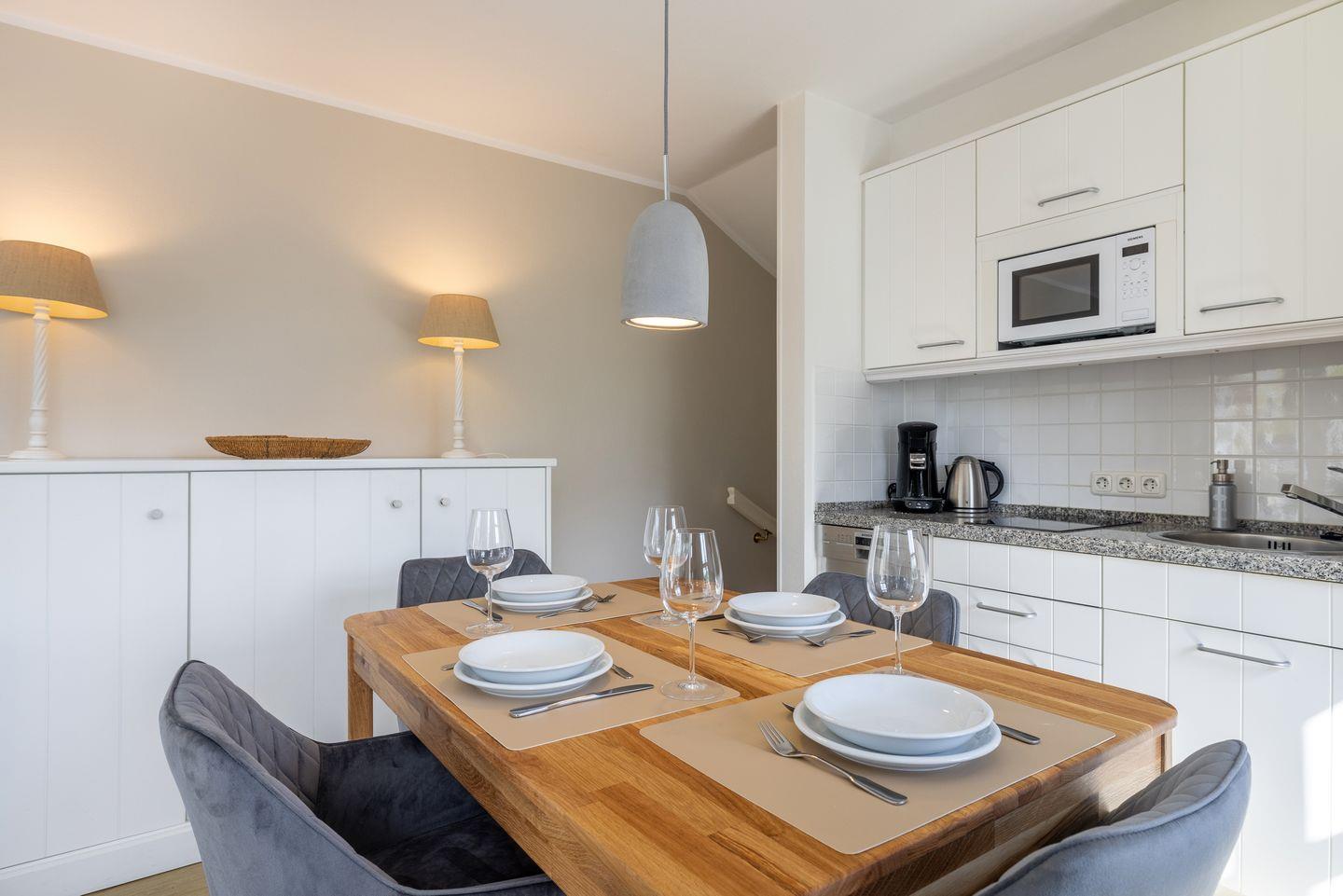 - Wohn- Essbereich mit kleine Küchenzeile mit Mikrowelle, Geschirrspüler, von hier aus haben Sie Zutritt zur Terrasse mit Gartengestühl (April bis Oktober) und der Sonnenkuhle mit einem Strandkorb ( Westlage)