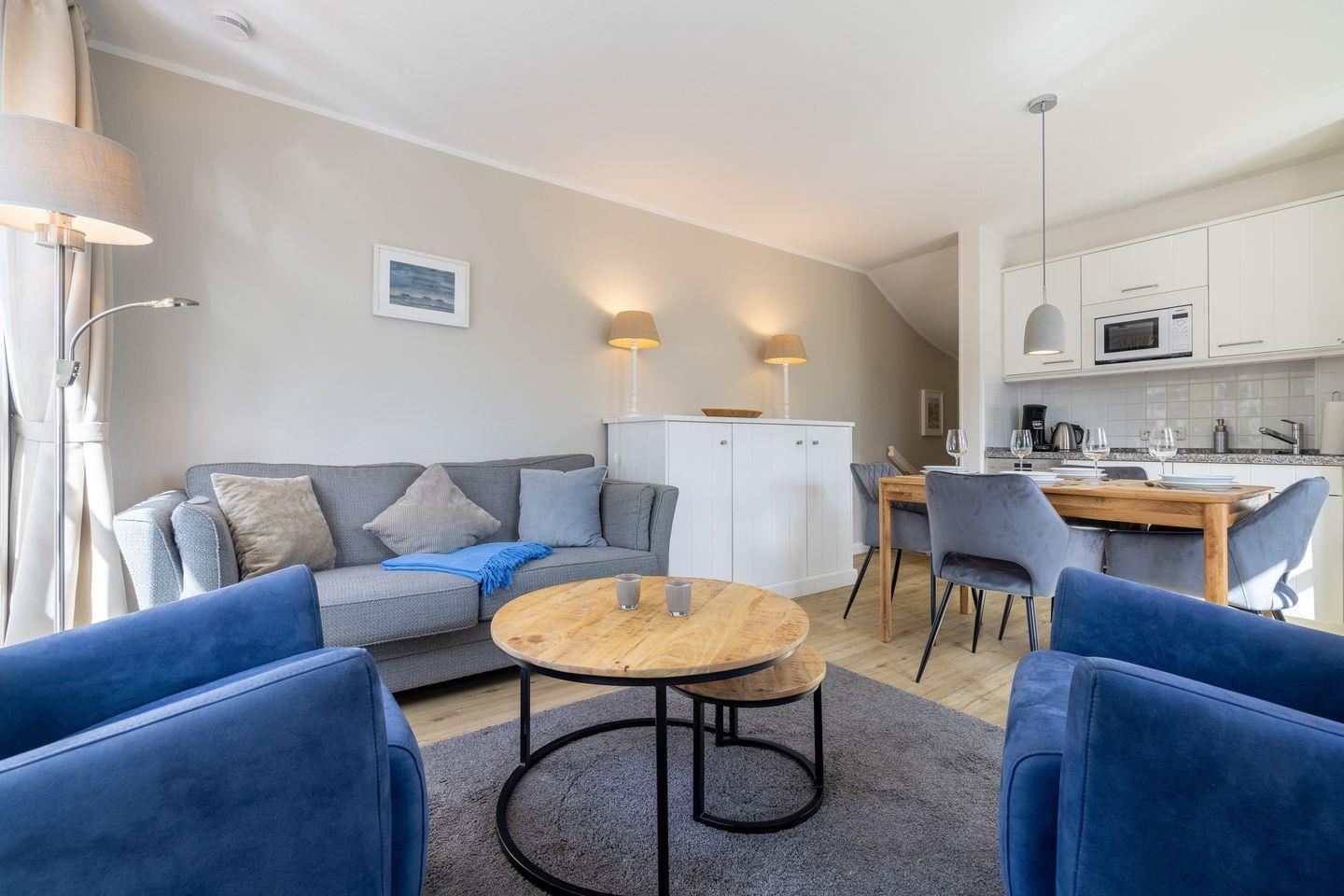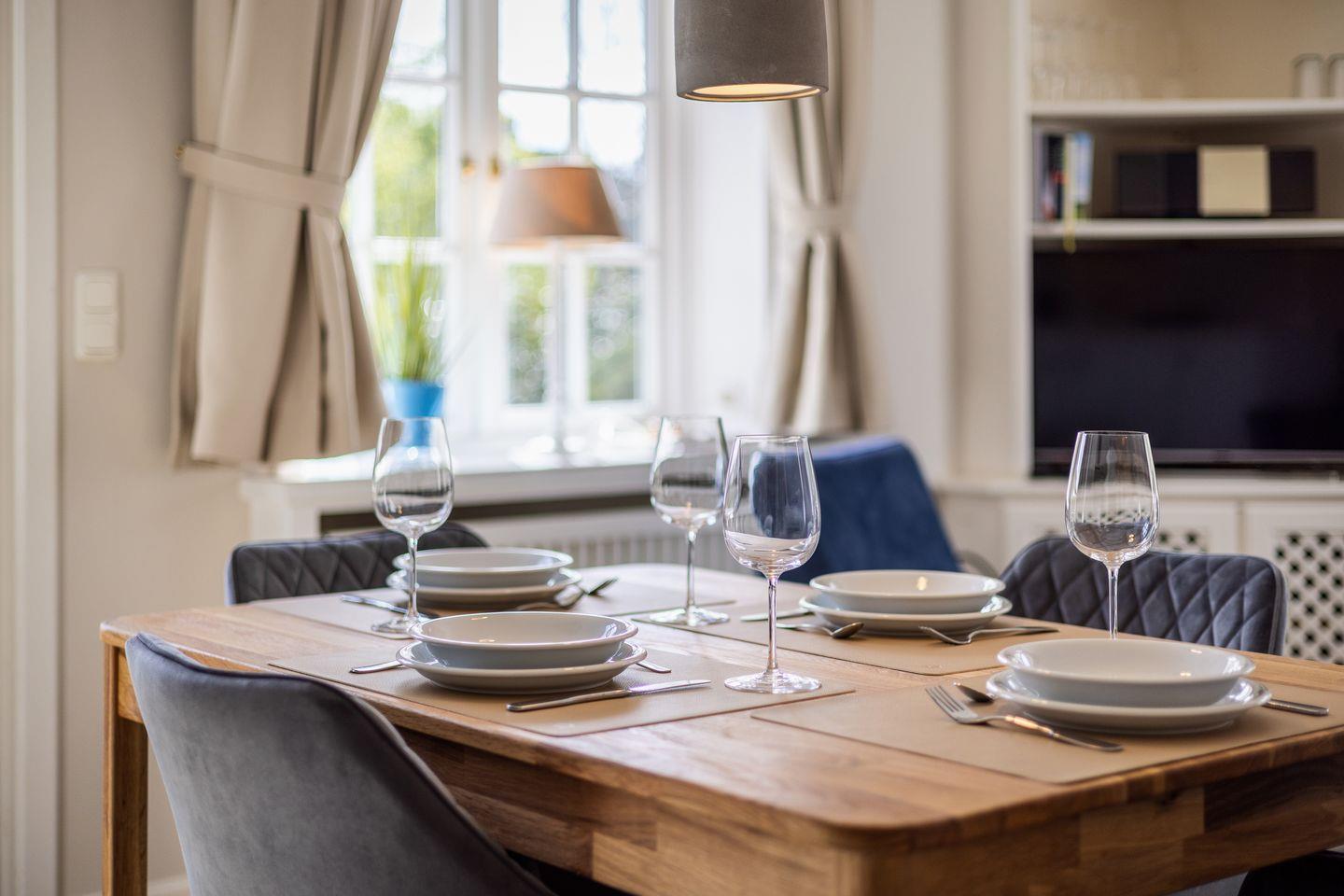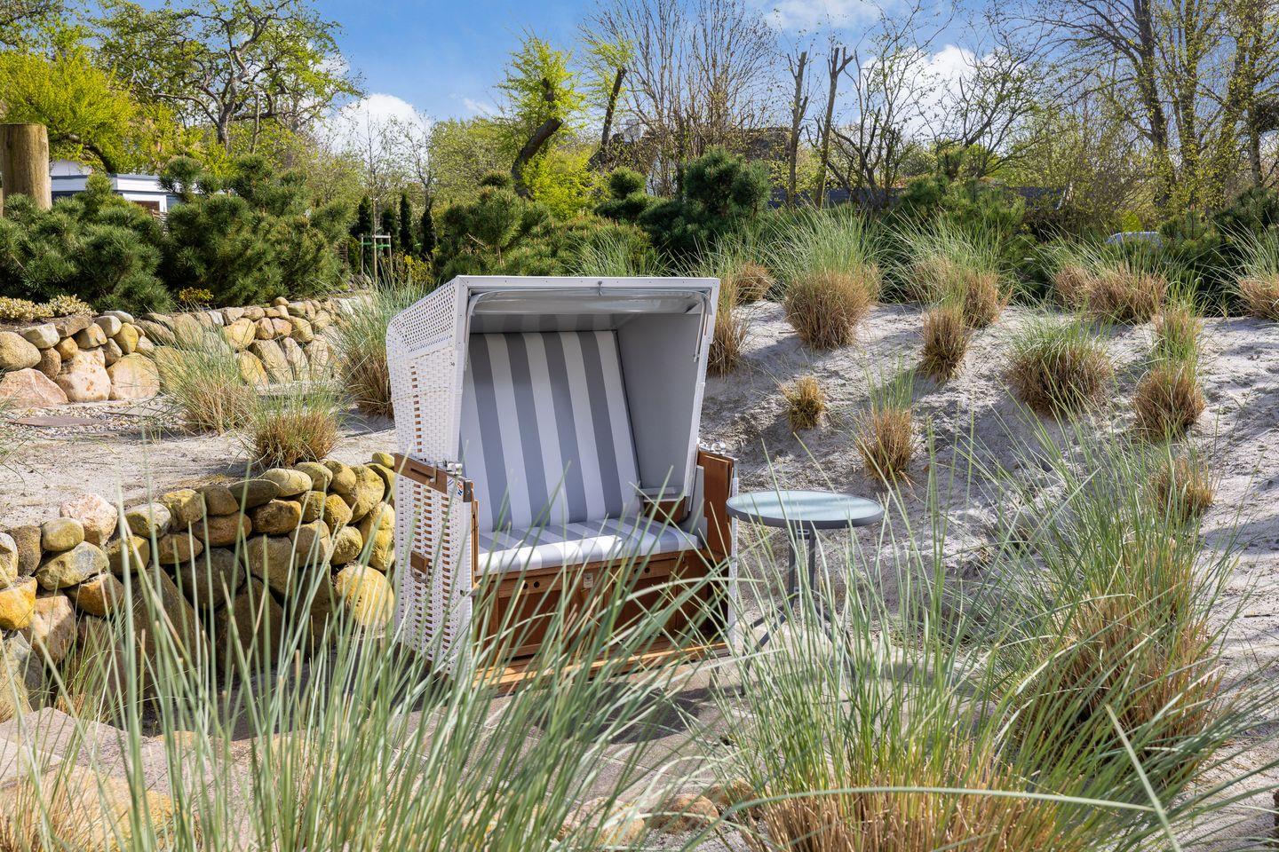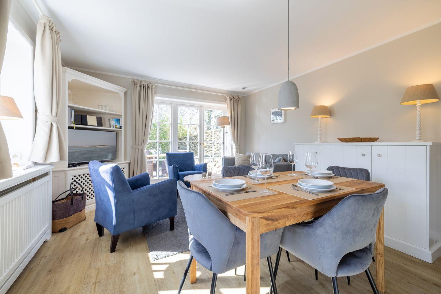 - Wohn- Essbereich mit kleine Küchenzeile mit Mikrowelle, Geschirrspüler, von hier aus haben Sie Zutritt zur Terrasse mit Gartengestühl (April bis Oktober) und der Sonnenkuhle mit einem Strandkorb ( Westlage)