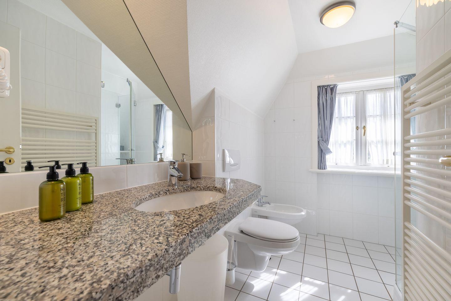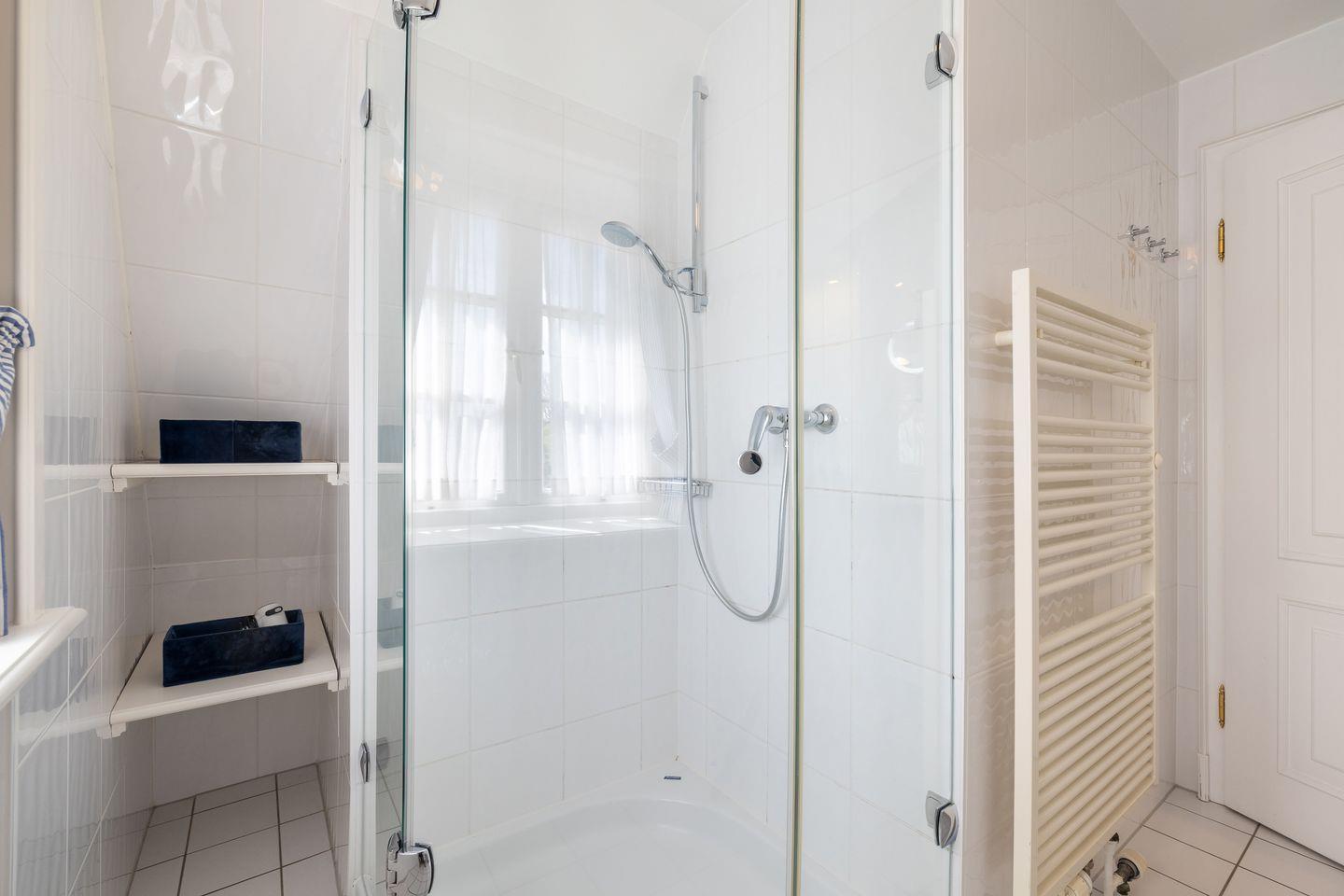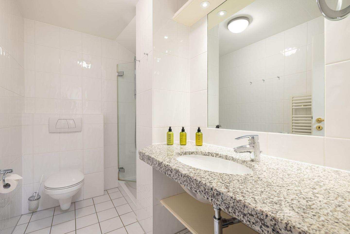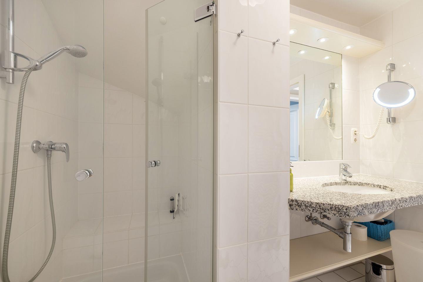 - 1 Badezimmer mit Dusche, WC und Schminkspiegel