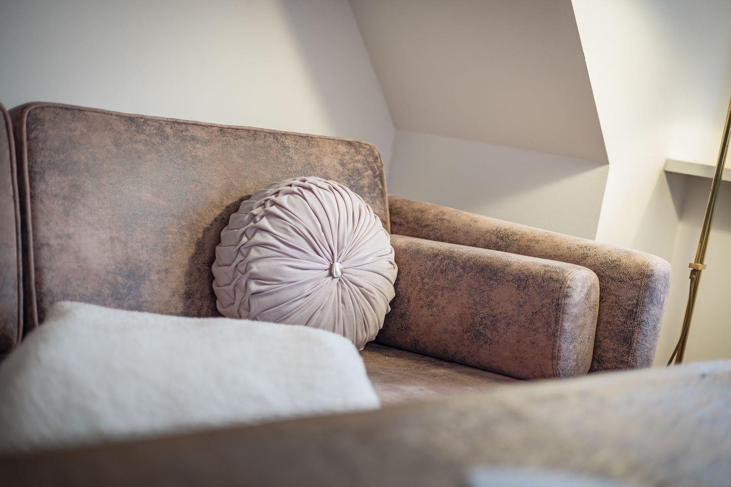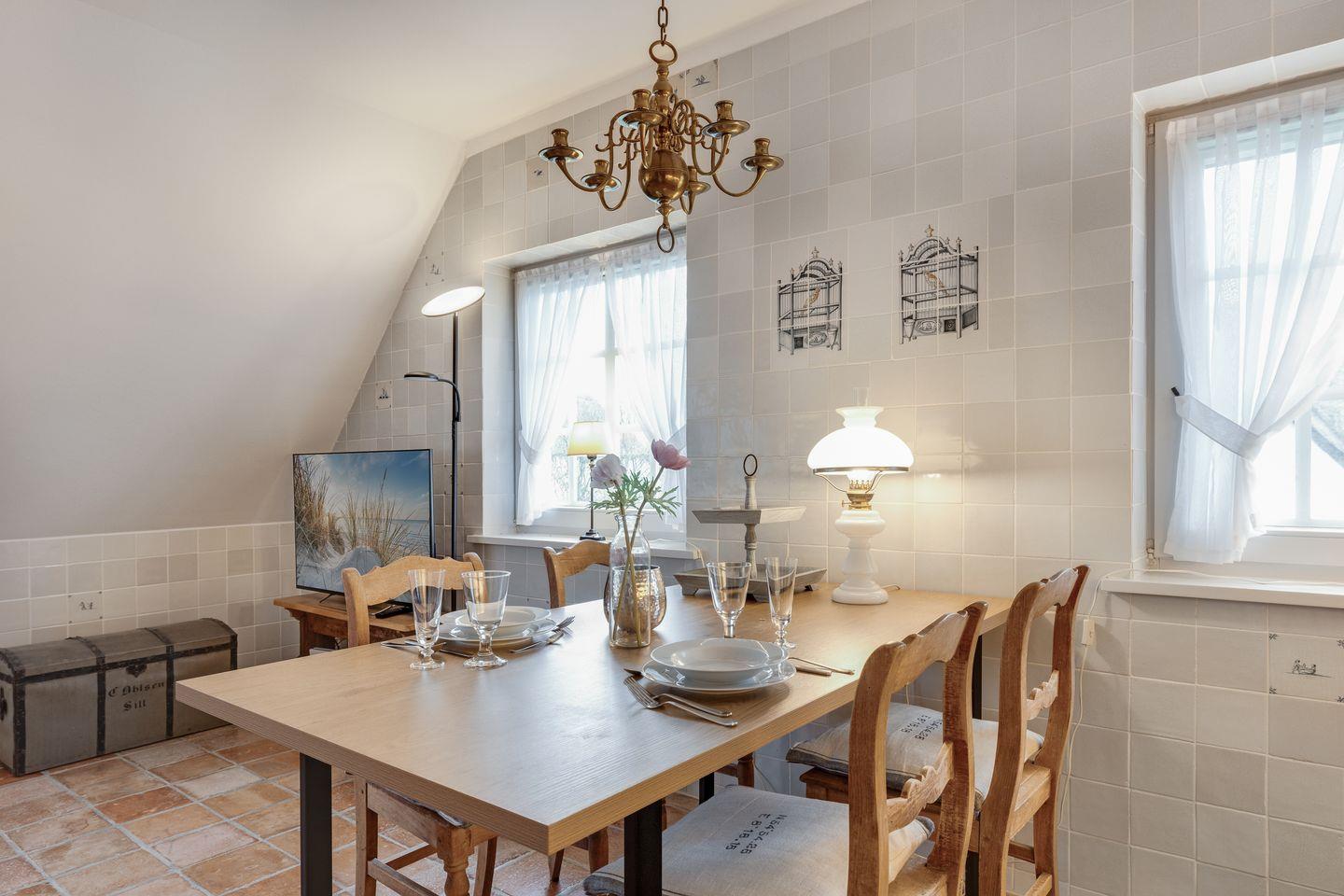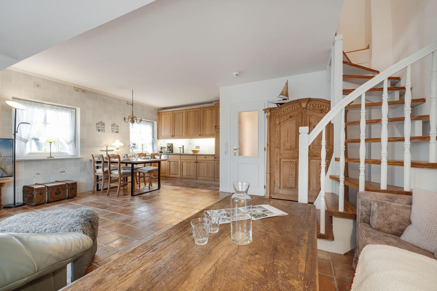 Die Wohnung verfügt über ein gemütliches Schlafzimmer mit Doppelbett (200x200cm) und einem großzügigem Kleiderschrank, in dem Sie erholsame Nächte verbringen können, und ein großzügiges Wohnzimmer mit einer Sofaecke, die zum Verweilen einlädt. Hier können Sie nach einem erlebnisreichen Tag auf der Insel entspannen, während Sie Ihren Lieblingsfilm auf dem Fernseher mit Kabelanschluss schauen oder einfach nur die Atmosphäre genießen. Die offene Küche ist voll ausgestattet mit modernsten Geräten, darunter ein Cerankochfeld, Geschirrspüler, Kühlschrank und eine Nespresso-Maschine, damit Sie Ihren Morgenkaffee ganz nach Wunsch zubereiten können. Der Esstisch im Essbereich bietet genügend Platz für gemütliche Mahlzeiten.