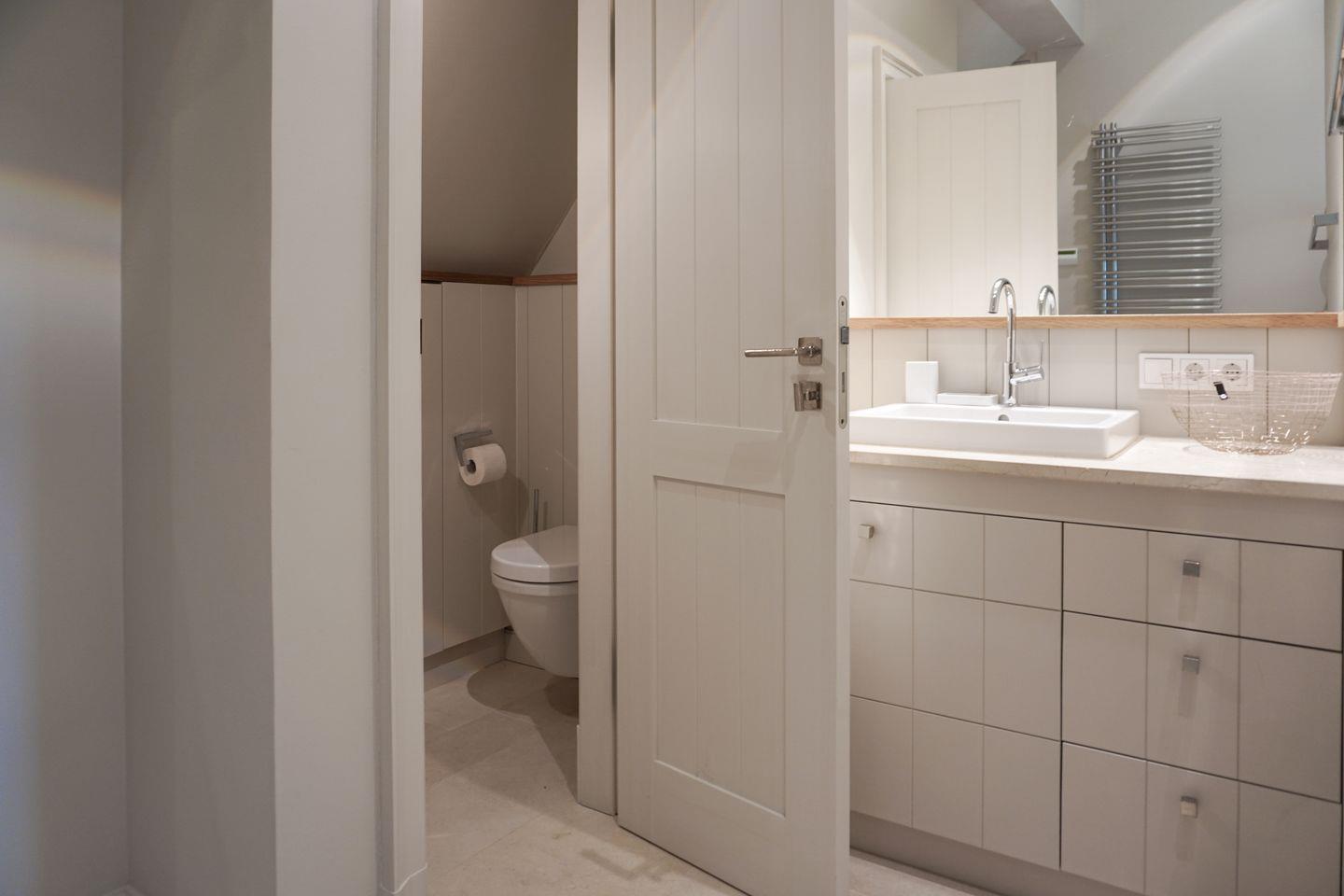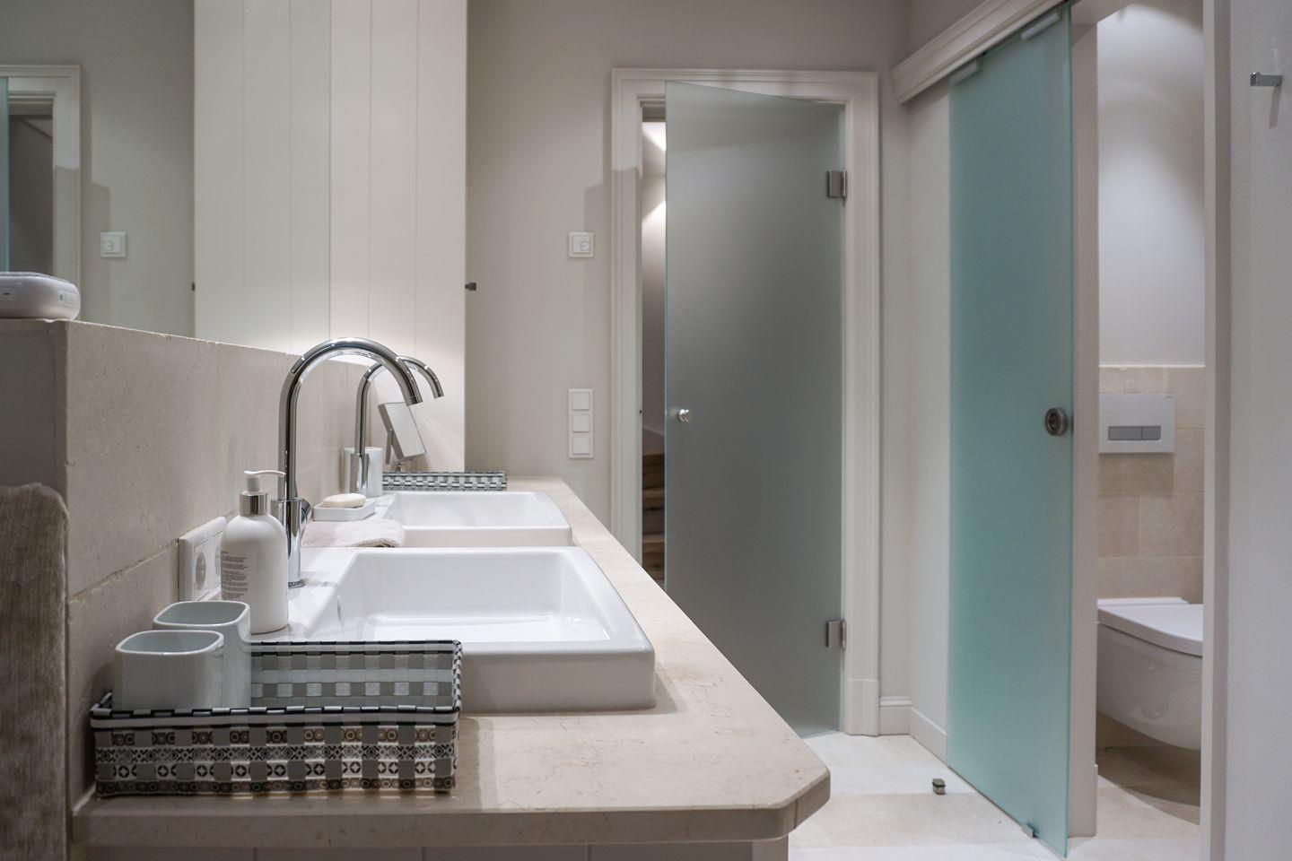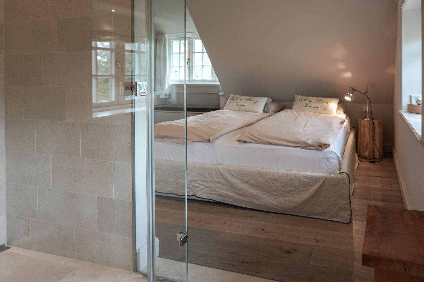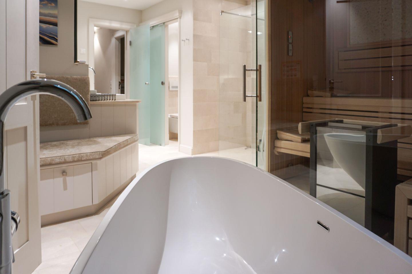 Das Haus bietet drei moderne Badezimmer, die jeweils über eine bodengleiche Dusche verfügen. Zusätzlich gibt es zwei Gäste-WCs. Für Komfort sorgen eine Badewanne und eine Sauna zur Eigennutzung, die entspannende Stunden verspricht. Die Bäder sind teilweise mit Kosmetikspiegel, Ganzkörperspiegel ausgestattet. Handtücher, Bettwäsche, eine Erstausstattung an Badausstattung sowie Geschirrhandtücher werden bereitgestellt.