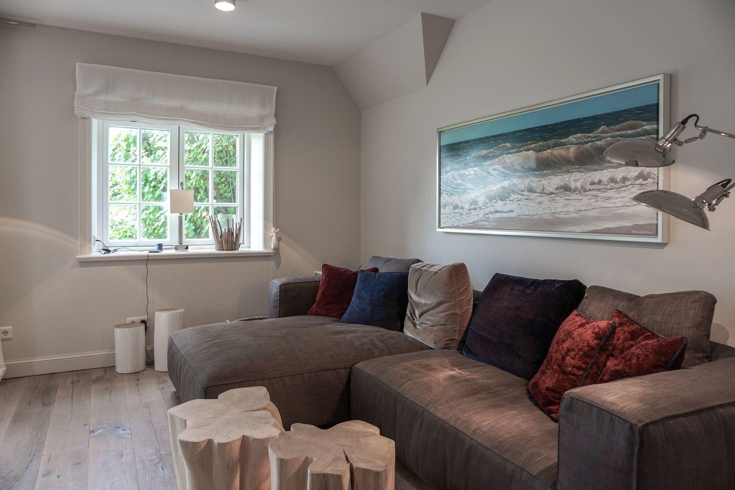Im Inneren des Hauses verteilen sich fünf Zimmer über drei Etagen. Insgesamt stehen Ihnen vier Schlafzimmer zur Verfügung, davon zwei im Untergeschoss und zwei in der oberen Etage. 3 der vier Schlafzimmer haben das Bad en suite. Alle Schlafzimmer sind mit Dielenboden ausgestattet, der ebenso wie der Fußboden im Wohnzimmer eine warme und einladende Atmosphäre schafft. Die Wohnräume sind großzügig gestaltet und zeichnen sich durch eine hochwertige Möblierung aus. Eine gemütliche, große Sofaecke und ein moderner Kaminofen im Wohnzimmer sorgen auch an kühleren Tagen für Behaglichkeit. Fünf digitale Fernseher ermöglichen Ihnen individuelle Unterhaltung in verschiedenen Räumen.