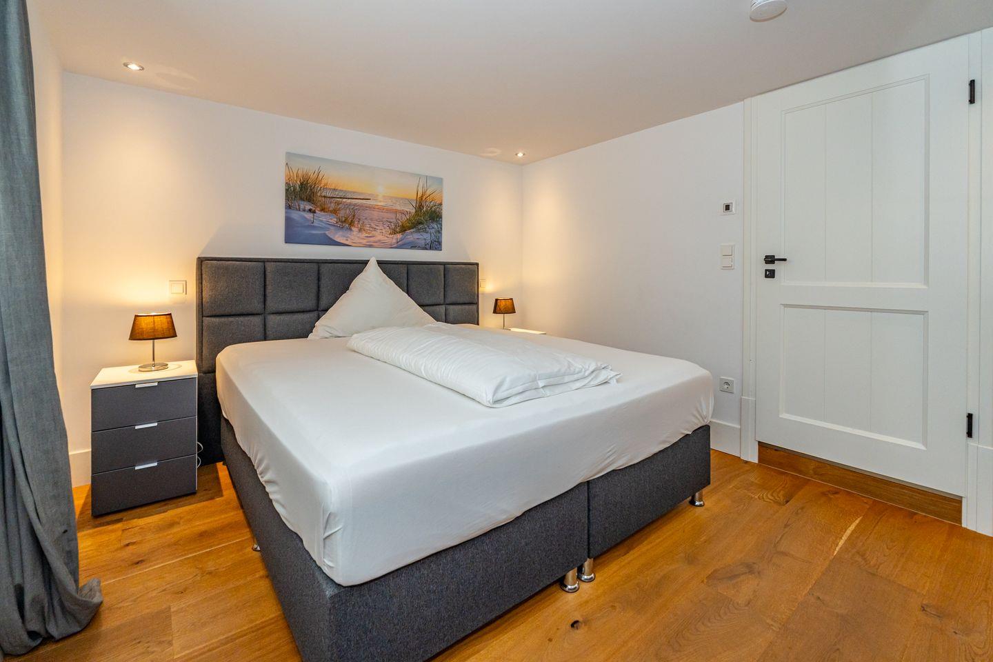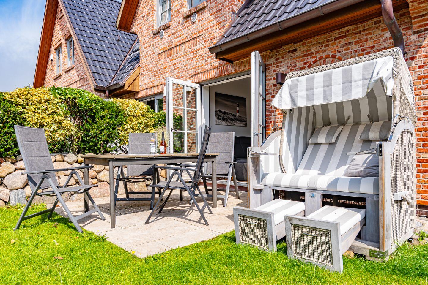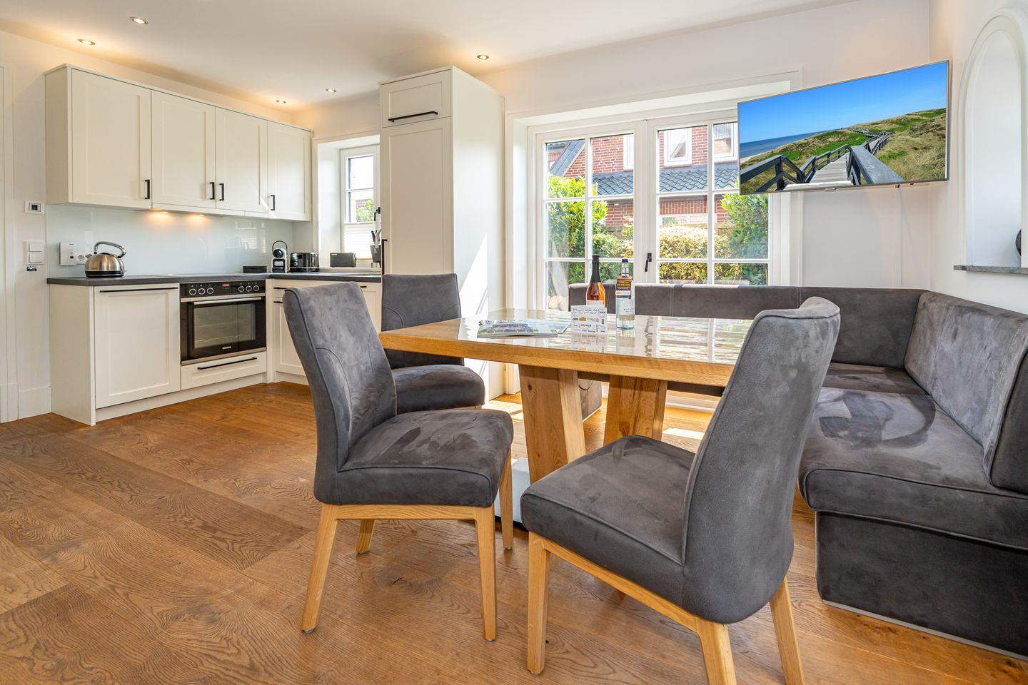 Im Erdgeschoss dieses End-Ferienhausteil befindet sich der helle Wohn- und Essbereich mit einer offenen Küche, ausgestattet mit einem Backofen, Gefrierfach, Nespressokapselmaschine und Wasserkocher. Von hier aus gelangen Sie auf die Terrasse mit dem typischem Sylter Strandkorb (saisonal) und Gartenmöbeln. Nun sind es nur noch ein paar Schritte zu der Blocksauna, die Ihnen in Ihrem Vorgarten zur alleinigen Nutzung zur Verfügung steht. Ebenfalls im Erdgeschoss befindet sich ein Gäste WC. Im Souterrain liegen zwei der drei Schlafzimmer, selbstverständlich mit gemütlich Boxspringbetten und Flat Screen. Außerdem befindet sich auf dieser Ebene ein Badezimmer mit Dusche. Das dritte Schlafzimmer befindet sich, im ersten Obergeschoss. Ebenso das zweite Badezimmer mit Dusche. Ein Parkplatz befindet sich am Ferienhaus.