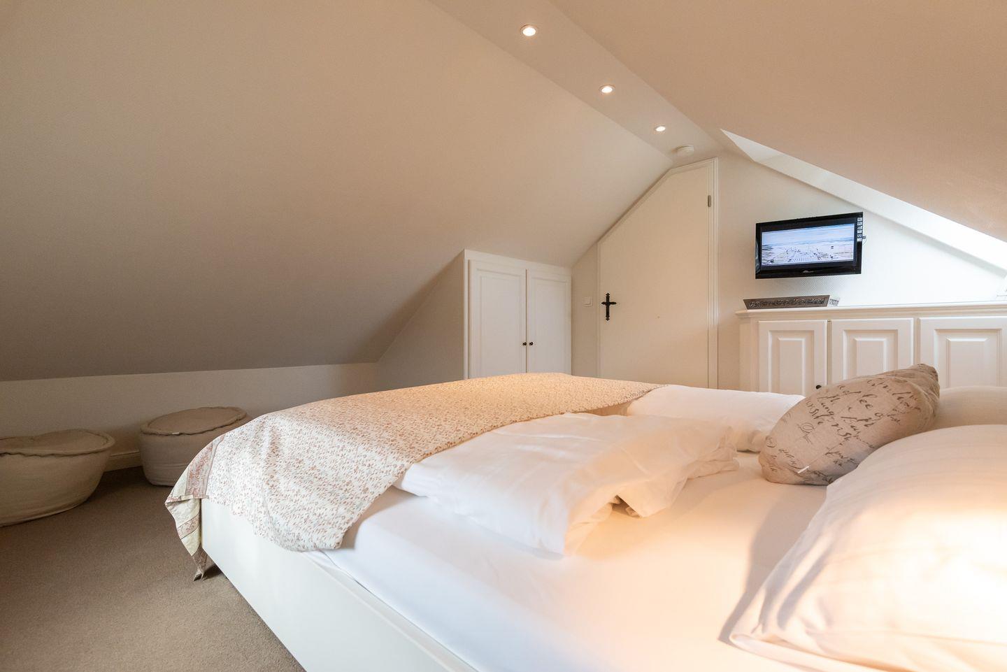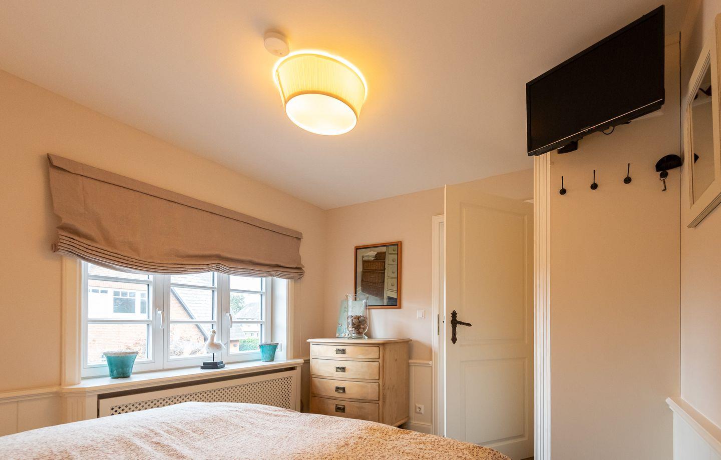 Schlafzimmer 2: Helles Doppelbettschlafzimmer mit Einbauschränken, TV und Fenster.