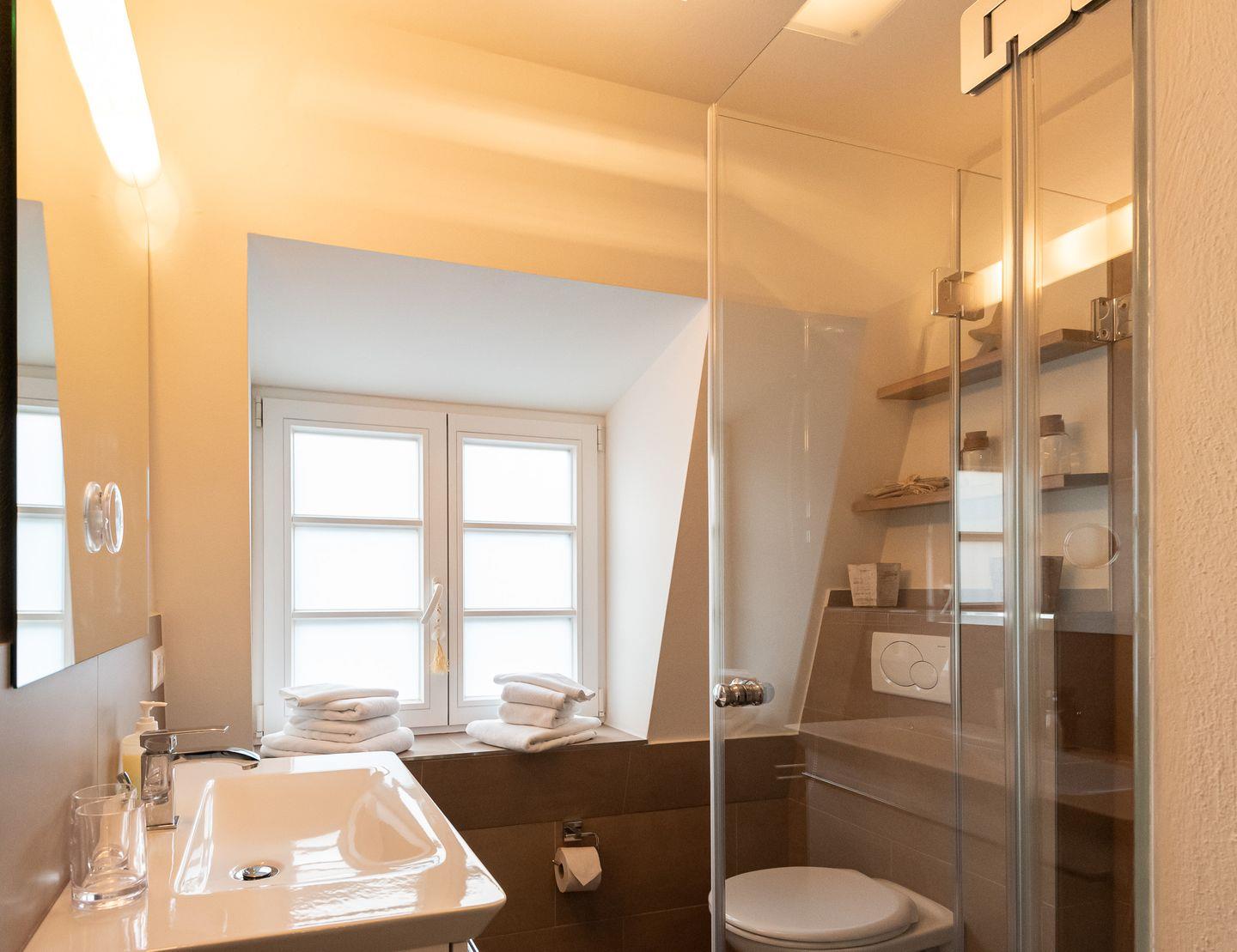Badezimmer 2: Modernes Duschbad mit Fenster.