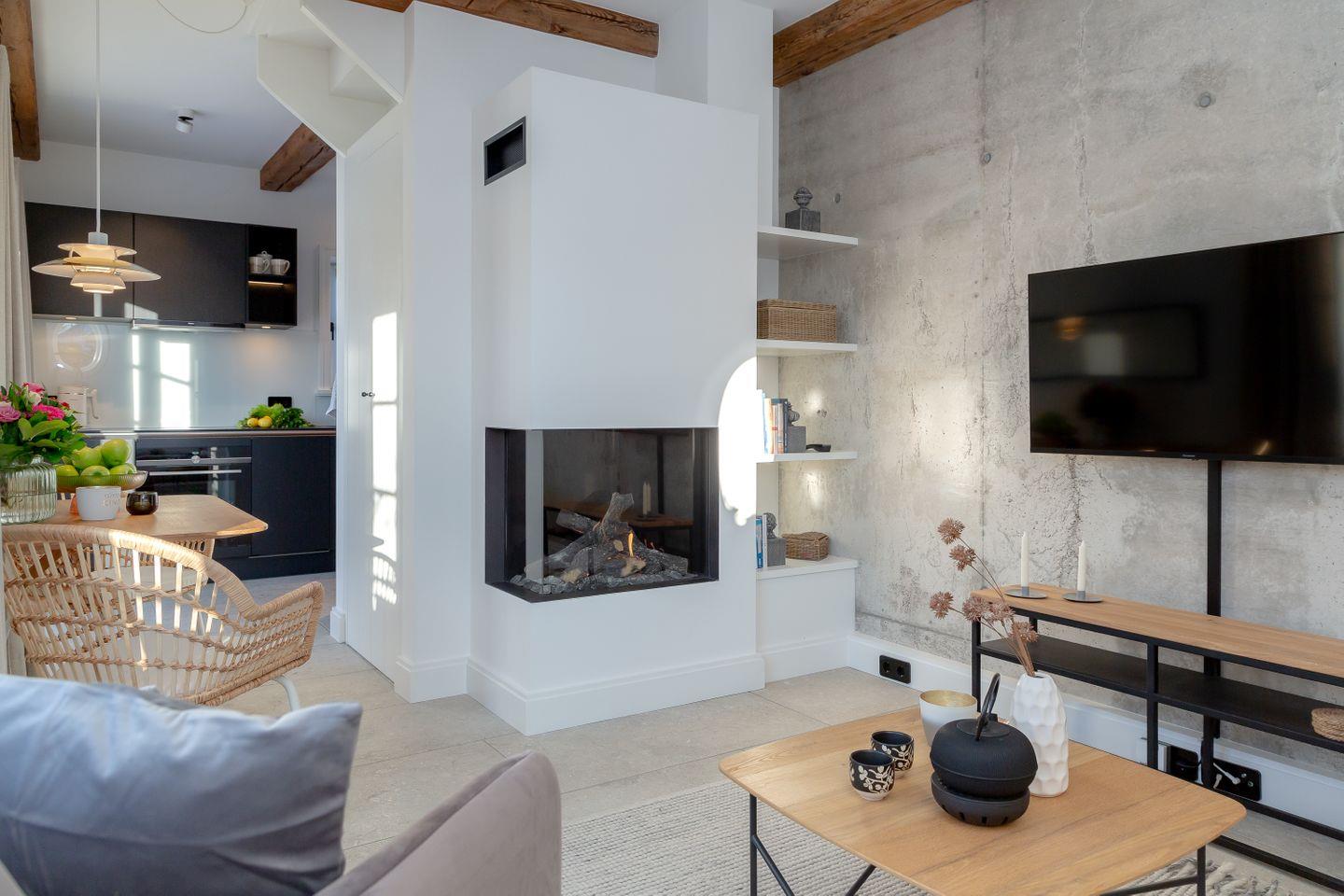 Ein besonderes Highlight ist die Wandgestaltung aus Sichtbeton, die in Kombination mit Altholzbalken und weißen Einbauelementen die maritimen Details stilvoll in Szene setzt.