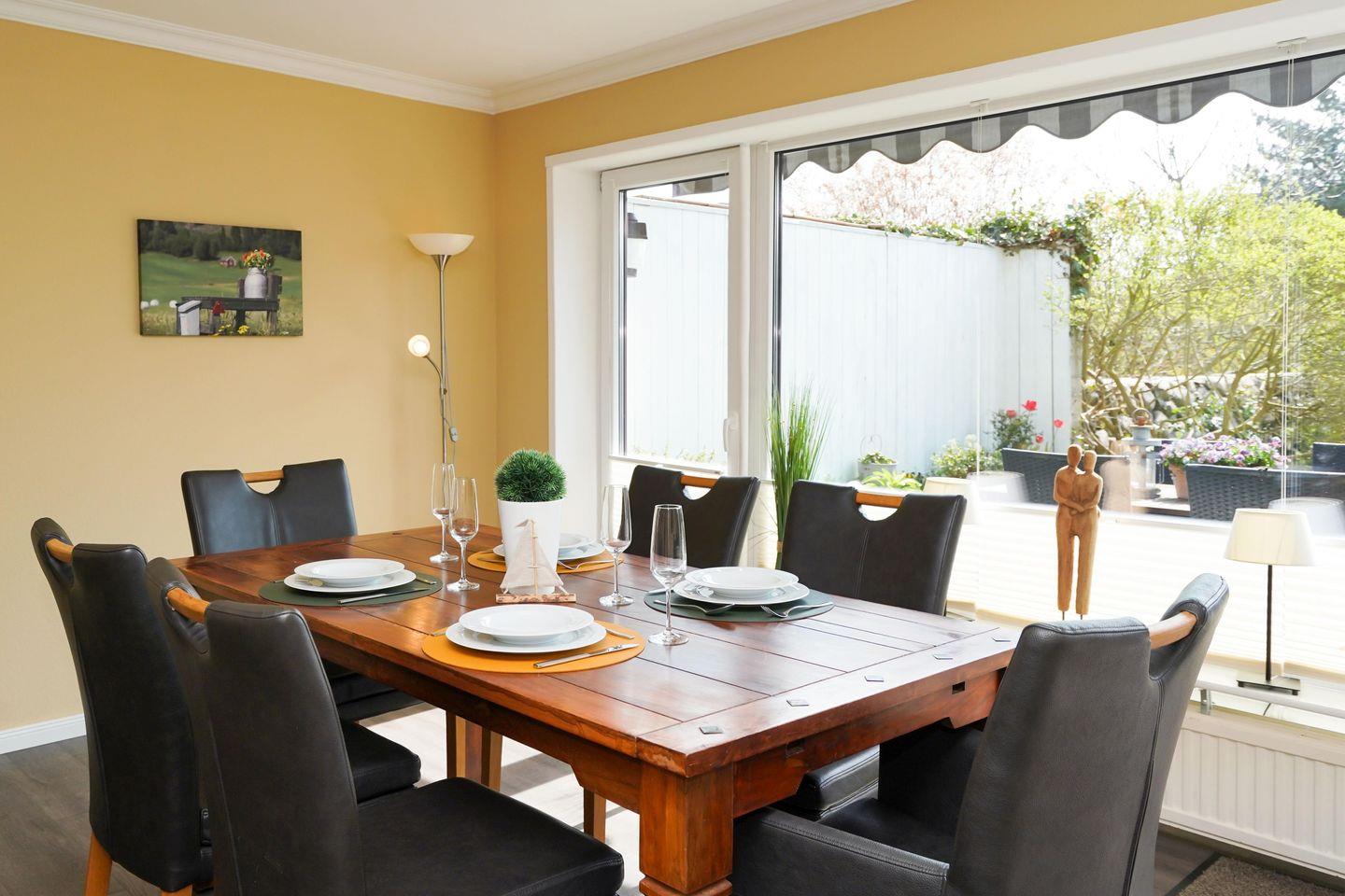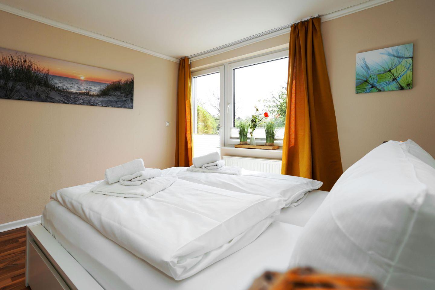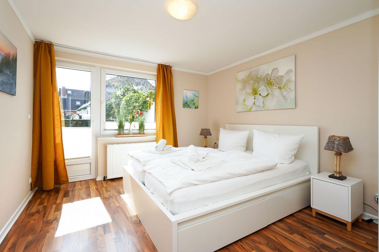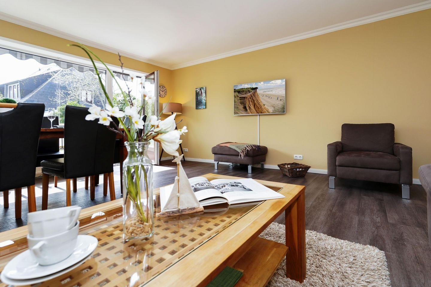 Diese familienfreundliche ca. 80 m² große Erdgeschosswohnung für bis zu 4 Personen bietet Ihnen ein gemütliches Wohn- und Esszimmer mit Kabel-TV sowie eine voll ausgestattete Küche samt Geschirrspüler, zwei Doppelschlafzimmer und ein Duschbad. Nutzen Sie gerne den eingezäunten Garten mit eigener Südterrasse und einem Strandkorb (in der Saison). Die Ferienwohnung verfügt über WLAN, einen zugehörigen PKW-Stellplatz, eine Waschmaschine sowie einen Wäschetrockner. Haustiere sind erlaubt.