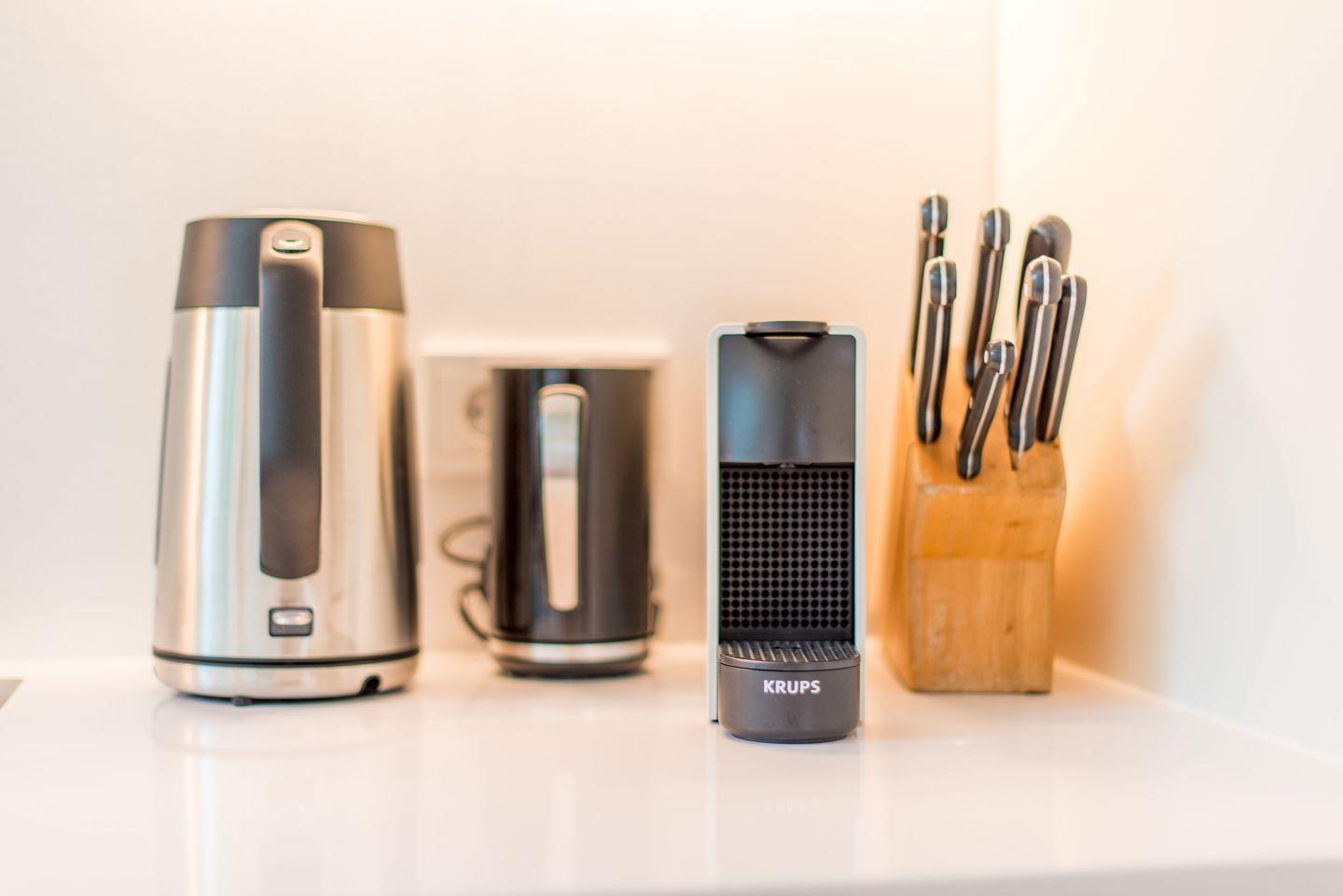 Die Küche bietet modernen Komfort und ist ausgestattet mit einem Cerankochfeld, einem Backofen mit integrierter Mikrowelle, einem Geschirrspüler und einem großzügigen Kühl-Gefrierschrank. Hier finden Sie alles, was Sie zur Zubereitung von Mahlzeiten in einer angenehmen Umgebung benötigen.