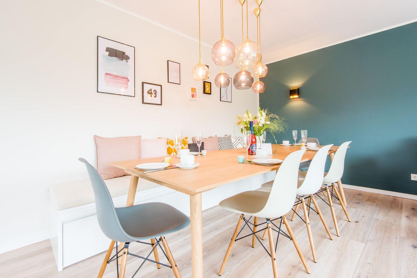 Im einladenden Wohn- und Essbereich erwartet Sie ein großer Esstisch für sechs Personen, der zu gemeinsamen Mahlzeiten einlädt. Ein komfortables Sofa und ein TV sorgen für entspannte Abende. Der direkte Zugang zur Terrasse und dem großzügigen Garten, der mit einem Strandkorb ausgestattet ist, schafft zusätzlichen Raum im Freien – ideal, um die Nordseeluft zu genießen und sich zu erholen.